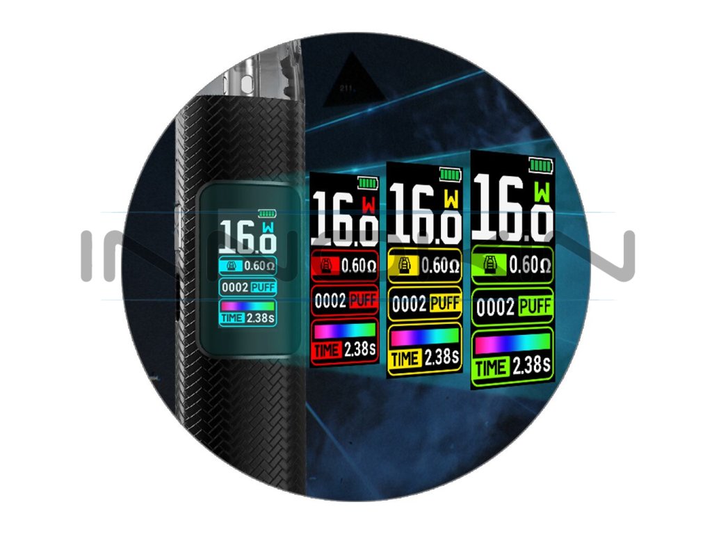 Hlavní výsadou zařízení je barevný TFT displej na předním panelu. Ten vás neustále informuje o stavu baterie, nastaveném výkonu, počtu potahů, odporu cartridge a čase posledního potahu. Díky barevnému rozhraní je nastavení jednodušší, než kdykoliv předtím.