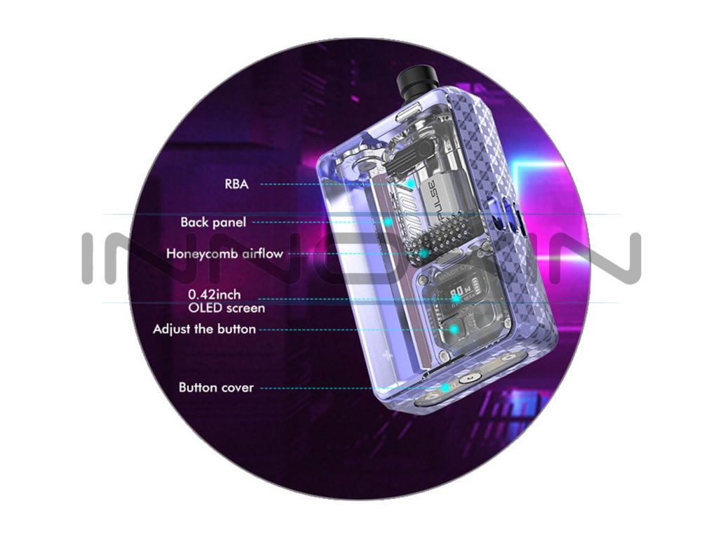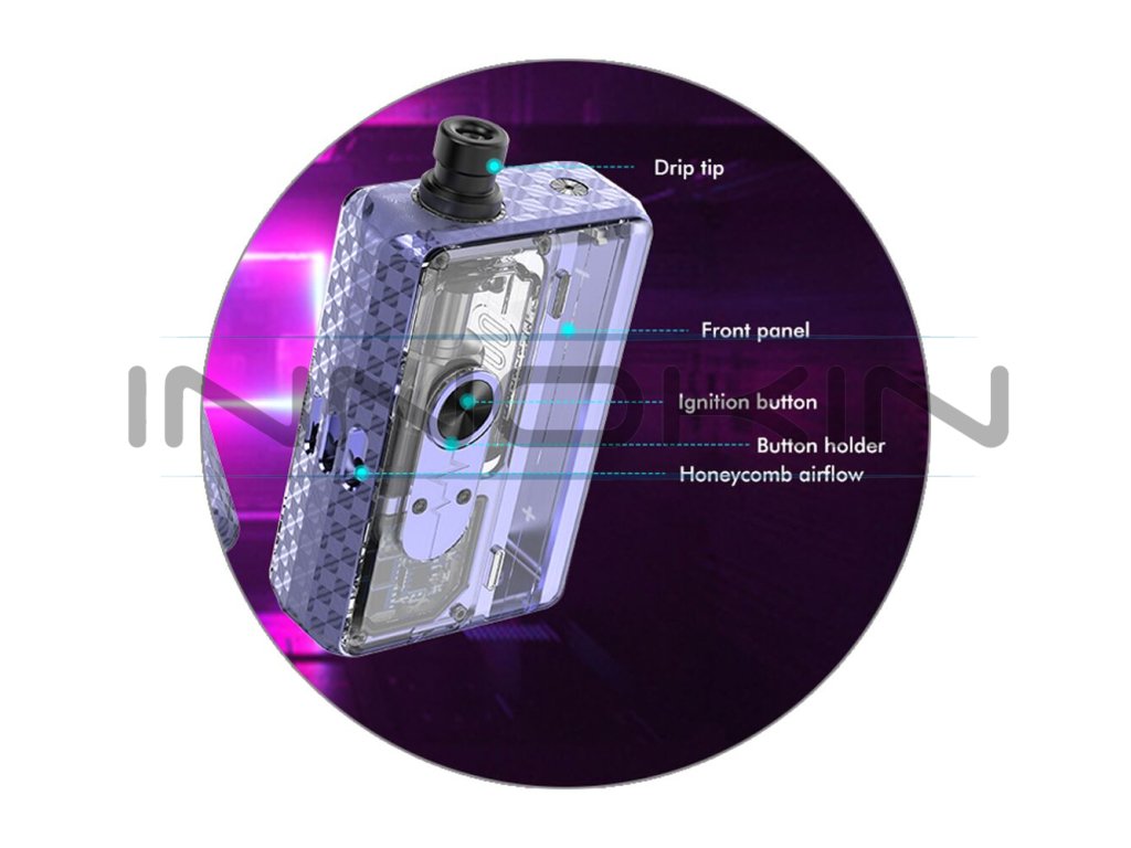 Na bočním a předním panelu se nachází řada menších otvorů určených k přísunu vzduchu ke cartridgi. Díky pečlivému rozvržení těchto vzduchových otvorů proudí vzduch do těla zařízení rovnoměrně a zajišťuje tak jemnou a hladkou produkci páry s maximálním důrazem na výraznou a prokreslenou chuť e-liquidu.