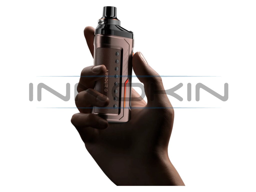Luxusně zpracovaný pod mod Armour G se pyšní bytelnou kovovou konstrukcí a krásně zpracovanými koženými panely. Nabídne také perfektní ergonomii pro pohodlné držení v dlani během používání. Zadní zaoblená část krásně kopíruje vaši dlaň a vapování vás tak bude doslova bavit. Oproti jiným pod modům s podobnými vlastnostmi navíc nabídne až o 30% menší konstrukci, celkové rozměry se zastavily na krásných 113 x 38 x 28 mm.