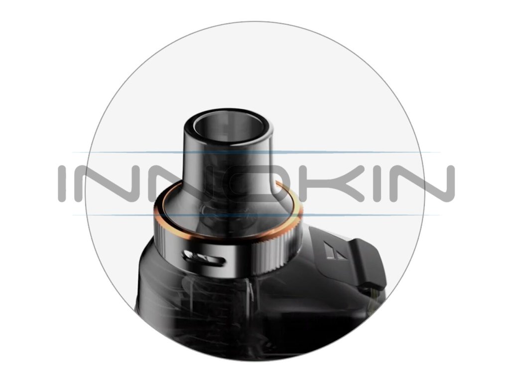 Ve vrchní části zařízení najdete novou cartridge Vaporesso Armour G Series s obrovským objemem. Hravě do ní doplníte až 5ml e-liquidu. S tímto slušným zásobníkem se můžete těšit na dlouhé hodiny intenzivního odpařování s minimem doplňování. A právě samotné plnění je vymyšleno u cartridge velmi intuitivně. Nachází se v horní části a tvoří ho pouze praktická silikonová záslepka. Do plné kapacity tak zvládnete cartridge naplnit čistě a rychle, doslova za pár vteřin.