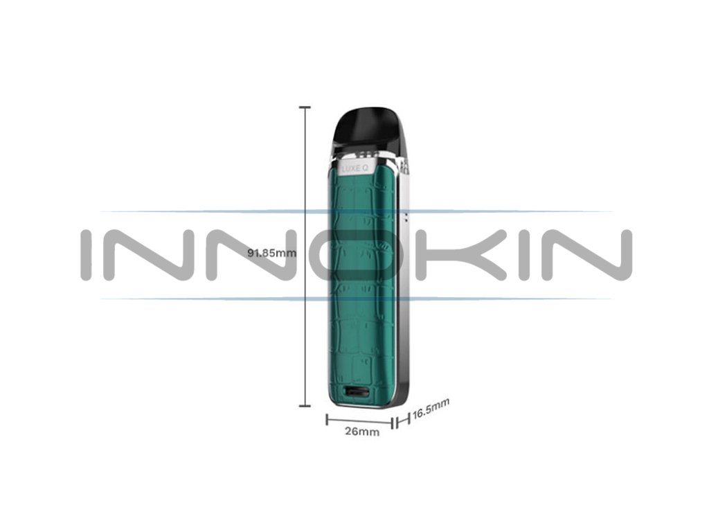 Vaporesso LUXE Q Pod Kit je kompaktní elektronická cigareta typu pod, která láká na moderní design a velkou kapacitu baterie. Cílí na příznivce klasického šlukování a na začátečníky, kteří hledají jednoduché zařízení bez složitého nastavování. Je tvořena pouze dvěma částmi, tělem baterie a cartridgí na e-liquid. Rozměry celé e-cigarety činí jen 91,85 x 26 x 16,5 mm. Díky tomu si ji snadno schováte do kapsy a pohodlně se drží v ruce. I přes své kompaktní rozměry disponuje integrovanou baterií s obrovskou kapacitou 1000 mAh. Tato baterie si poradí s intenzivním mnohahodinovým provozem bez nutnosti nabíjení. O stavu baterie jste informováni pomocí LED diody na těle. V případě potřeby dobití pak sáhnete po USB-C kabelu a pohodlně ji dobijete. Při zvolení 1 A adaptéru se dokáže dobít už za jednu hodinu.