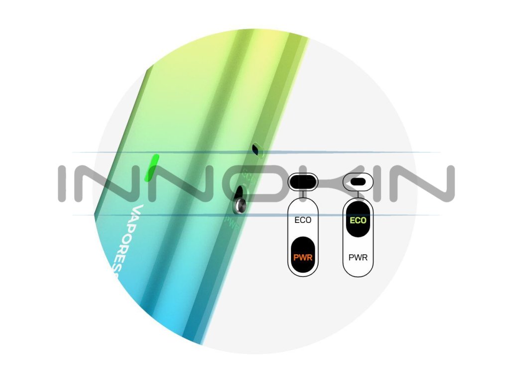 Unikátní přepínač nacházející se na boční straně je rozhodně nejzajímavějším prvkem této novinky. Umožňuje rychlou změnu výkonu a současně i tuhosti potahu pouhým posunutím do strany. Elektronika sama upraví výkon v závislosti na aktuálním režimu a odporu použité cartridge. Zvolit můžete režim ECO nebo POWER (14 W/0,8 Ω nebo 24 W/0,4 Ω s předinstalovanou cartridgí). Tímto způsobem získáte z jednoho zařízení dva zcela odlišné zážitky.