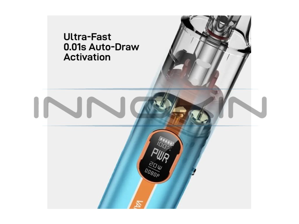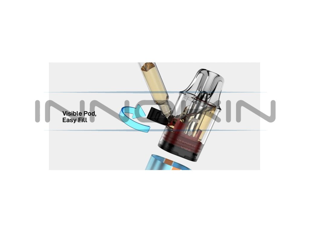 Vaporesso Vibe Pod Kit. Novinka zaujme nejen moderním vzhledem, ale především inovativní technologií Dual Mesh Coil, která přináší plnější chuť liquidu a delší životnost cartridge. Tělo baterie je vyrobeno z lehkého a odolného materiálu, který v sobě ukrývá monočlánek o kapacitě 1100mAh s rychlým USB-C nabíjením (5V/2A) a výkonným čipem AXON. Ten umožňuje přepínání mezi režimy ECO (úsporný výkon) a PWR (plný výkon), přičemž zařízení zároveň umožňuje regulaci airflow a přizpůsobení potahu od utaženého po volný. Na přední straně je barevný 0,54" TFT displej, který informuje o stavu baterie i aktuálním režimu. Vyměnitelná cartridge o objemu 4,5ml je navržena pro maximální výdrž.