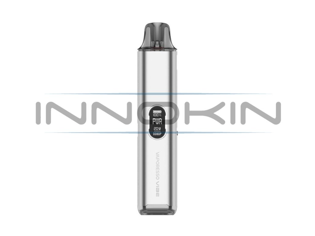 Vaporesso Vibe Pod Kit. Novinka zaujme nejen moderním vzhledem, ale především inovativní technologií Dual Mesh Coil, která přináší plnější chuť liquidu a delší životnost cartridge. Tělo baterie je vyrobeno z lehkého a odolného materiálu, který v sobě ukrývá monočlánek o kapacitě 1100mAh s rychlým USB-C nabíjením (5V/2A) a výkonným čipem AXON. Ten umožňuje přepínání mezi režimy ECO (úsporný výkon) a PWR (plný výkon), přičemž zařízení zároveň umožňuje regulaci airflow a přizpůsobení potahu od utaženého po volný. Na přední straně je barevný 0,54" TFT displej, který informuje o stavu baterie i aktuálním režimu. Vyměnitelná cartridge o objemu 4,5ml je navržena pro maximální výdrž.