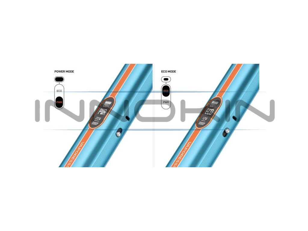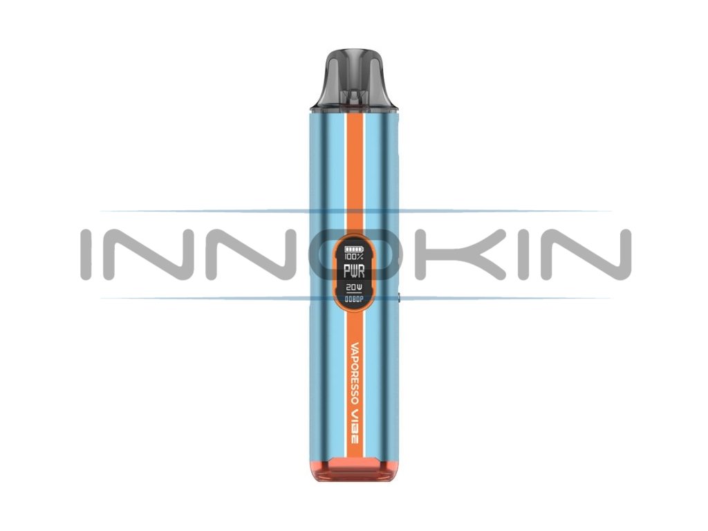 Vaporesso Vibe Pod Kit. Novinka zaujme nejen moderním vzhledem, ale především inovativní technologií Dual Mesh Coil, která přináší plnější chuť liquidu a delší životnost cartridge. Tělo baterie je vyrobeno z lehkého a odolného materiálu, který v sobě ukrývá monočlánek o kapacitě 1100mAh s rychlým USB-C nabíjením (5V/2A) a výkonným čipem AXON. Ten umožňuje přepínání mezi režimy ECO (úsporný výkon) a PWR (plný výkon), přičemž zařízení zároveň umožňuje regulaci airflow a přizpůsobení potahu od utaženého po volný. Na přední straně je barevný 0,54" TFT displej, který informuje o stavu baterie i aktuálním režimu. Vyměnitelná cartridge o objemu 4,5ml je navržena pro maximální výdrž.