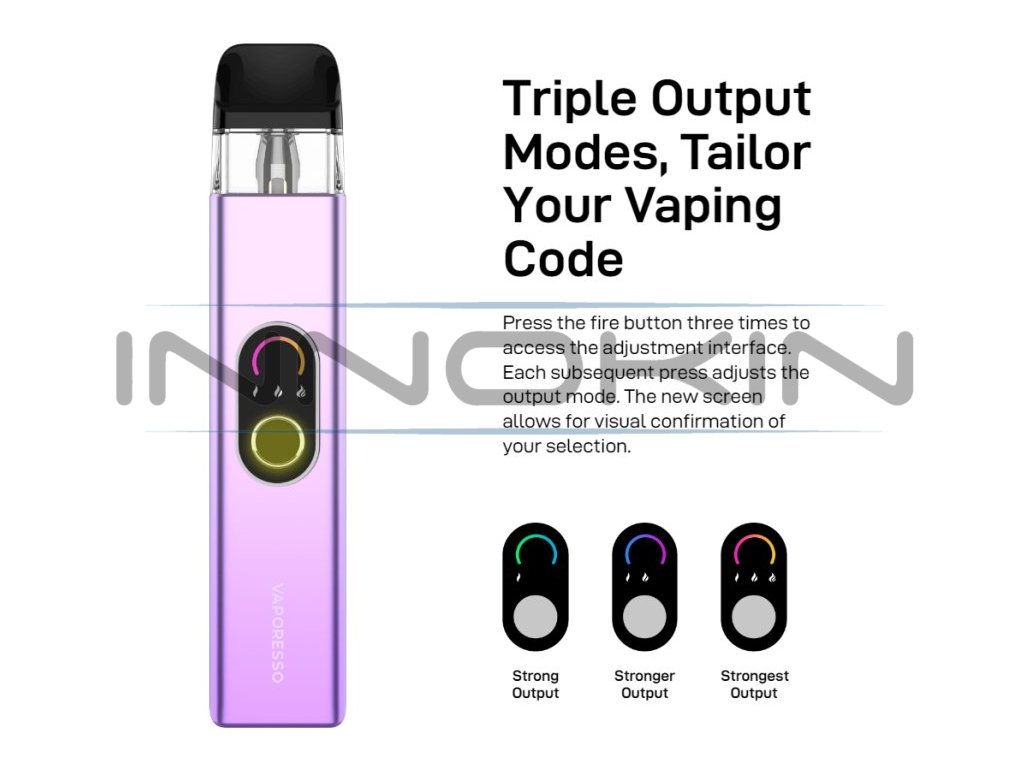 Oblíbenost elektronických cigaret XROS od Vaporessa stále strmě stoupá vzhůru. Proto se výrobce rozhodl představit již čtvrtou řadu tohoto prvotřídního zařízení s technologií Corex Heating Tech pro konzistentní chuť liquidu. Tělo baterie je vyrobeno z kvalitní hliníkové slitiny, které obsahuje monočlánek o kapacitě 1000mAh s USB-C nabíjením a moderním AXON čipem. Na přední straně baterie se nachází spínací tlačítko a přehledný displej, který Vás informuje o stavu nabití baterie a umožním vám nastavení výstupního režimu. Vyměnitelná cartridge XROS o objemu 3ml je kompatibilní se všemi modely této řady. Na vrchní straně baterie je umístěna důmyslná regulace přívodu vzduchu zajišťující skvělou dýmivost a autentickou chuť liquidu.
