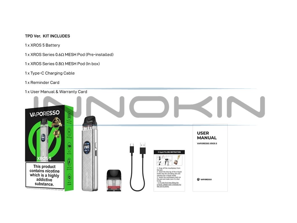 - 1x Tělo Vaporesso XROS 5 Pod (integrovaná baterie 1500mAh)