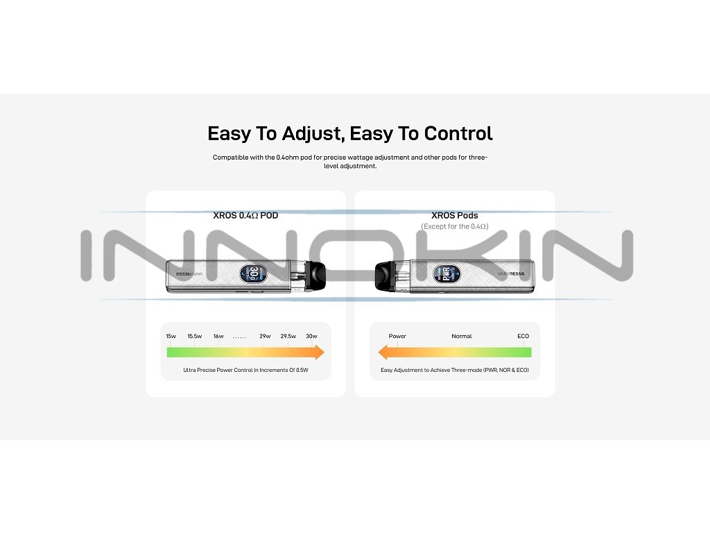 Výkonné parametryElektronická cigareta XROS 5 automaticky přizpůsobuje výstupní výkon podle odporu připojené cartridge. Při použití samostatně prodávané cartridge s odporem 0.4Ω dokáže zařízení dosáhnout až 30W výkonu. Inteligentní systém zajišťuje konstantní a stabilní reprodukci páry s bohatou chutí pro maximální požitek z vapování. |