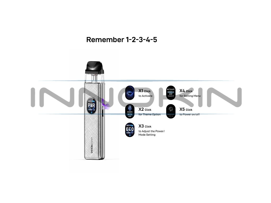 Inteligentní režimyZařízení nabízí tři přednastavené režimy intenzity vapování - PWR pro maximální výkon, NOR pro standardní používání a ECO pro úsporný provoz. Elektronická cigareta automaticky rozpozná připojenou cartridge a nastaví optimální parametry. Jednoduché ovládání jediným tlačítkem umožňuje rychlé přepínání mezi režimy třemi stisky. |