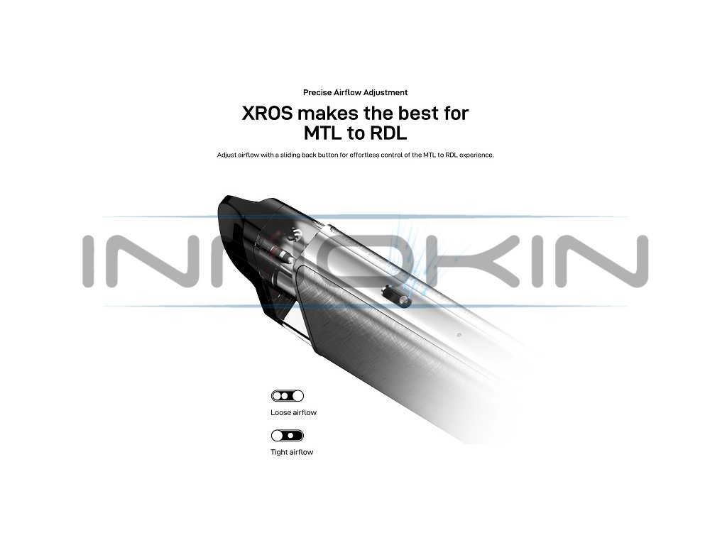 Nastavitelný airflowPraktická manuální regulace přívodu vzduchu umožňuje přesné nastavení tuhosti potahu podle vašich preferencí. Posouváním páčky na těle zařízení otevíráte nebo zavíráte otvor pro přívod vzduchu ke cartridgi. Můžete si tak vybrat mezi volnějším RDL stylem nebo utaženějším MTL potahováním pro optimální vapovací zážitek. |