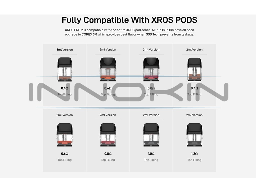 Pod CartridgeVyměnitelný Pod Cartridge o objemu 3 ml využívá praktický systém horního plnění, kdy jednoduše odejmete náustek a naplníte nádržku vaší oblíbenou e-liquidou. Konstrukce je navržena s důrazem na prevenci úniku e-liquidu. Cartridge je vybaven technologií SSS proti vytékání a je plně kompatibilní se všemi členy rodiny XROS včetně verzí s odpory 0,4 / 0,6 / 0,8 / 1,0 / 1,2 Ω. |