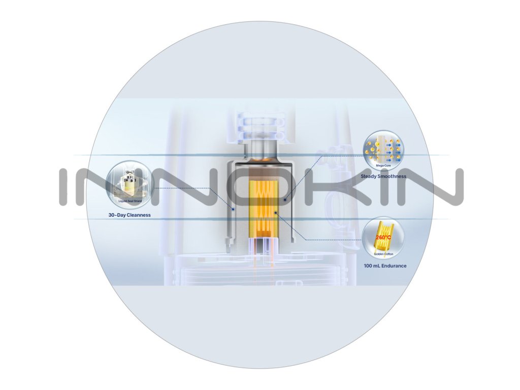 Nové cartridge Argus Pod Top Fill V2 se pyšní převratnou technologií iCOSM Code 2.0. Díky této technologii došlo ke kompletnímu přepracování jádra podu, které nově obsahuje široké Mega-Core jádro a speciální izolační štít (Liquid-Seal Shield) pro co nejefektivnější a nejrovnoměrnější zásobení vaty e-liquidem. Tento štít dokáže rovnoměrně nasát e-liquidem až 99% povrchu vaty uvnitř jádra. Mesh pletivo v jádru podu je obaleno inovativní a patentovanou zlatou vatou (Golden Cotton), která maximalizuje absorpci a prodlužuje životnost cartridge díky odolnosti vůči teplotě na spirálce až do 260 °C.