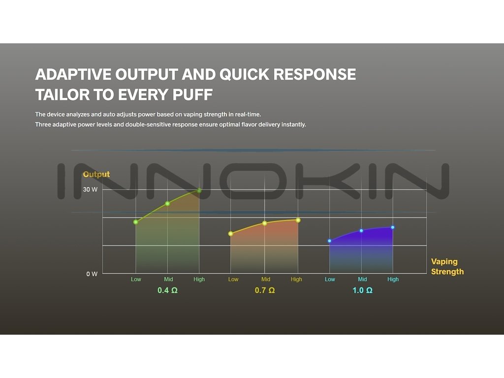 Adaptivní výkonPokročilá technologie adaptivního nastavení automaticky upravuje výkon v rozsahu 5-30W podle typu použitého podu a intenzity potahu. Inteligentní čip vyhodnocuje odpor spirálky a sílu potahu v reálném čase, čímž zajišťuje konzistentní a optimální vapovací výkon bez manuálního nastavování. |