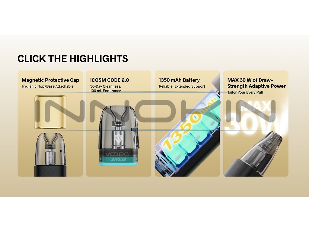 Technologické srdce Argus Klyc tvoří pokročilý čip s inteligentním rozpoznáváním, který vyhodnocuje nejen odpor použitého podu, ale také sílu potahu a automaticky upravuje parametry pro optimální výkon. Technologie iCOSM Code 2.0 zajišťuje efektivní nasycování vaty e-liquidem, rovnoměrné odpařování a okamžité žhavení pro bohatý chuťový zážitek. Praktické vrchní plnění podu eliminuje nutnost vyjímání cartridge z těla zařízení – stačí odklopit silikonovou krytku a doplnit oblíbenou náplň. Ergonomický tvar a kompaktní rozměry 100,6 x 29,7 x 17,2 mm činí z Argus Klyc ideálního společníka pro každodenní nošení. Boční posuvník pro regulaci přívodu vzduchu umožňuje nastavit styl vapování od volnějšího pusa-plíce až po těsnější MTL styl. Magnetické připojení víčka představuje praktické řešení – během vapování jednoduše přichytíte víčko na spodní část zařízení pomocí magnetu, takže se nikdy neztratí. Argus Klyc tak kombinuje stylový vzhled, pokročilou funkčnost a maximální pohodlí používání pro náročné uživatele elektronických cigaret.
