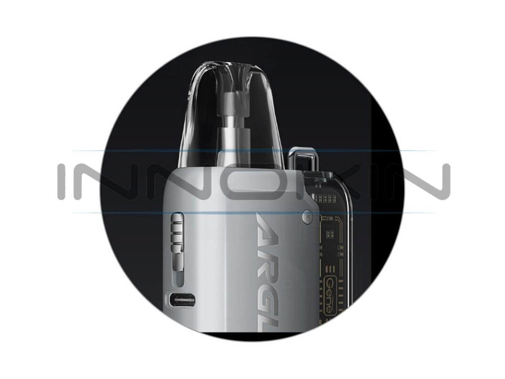 Futuristický design, prvotřídní výkon, extrémně rychlé nabíjení a inovativní čipset - VooPoo Argus P1 Pod Kit je stylová a luxusně zpracovaná elektronická cigareta typu pod, která padne přesně do kapsy. Na první pohled zaujme zejména svým futuristickým zpracováním. Jedna polovina těla nabídne kovovou konstrukci ze zinkové slitiny, přičemž druhá polovina disponuje polykarbonátovým transparentním krytím, můžete tak nahlédnout do vnitřní struktury celé e-cigarety a během užívání si bez problému prohlížet také celý čipset. Tělo je osazeno čipem GENE.AI 1.2, který přináší řadu inovativních funkcí v čele s automatickým spínáním potahu a automatickým nastavením intenzity potahování na základě tlaku vyvíjenému během potahu. Díky této technologii pracuje celé zařízení mnohem efektivněji a zachovává si delší životnost baterie.