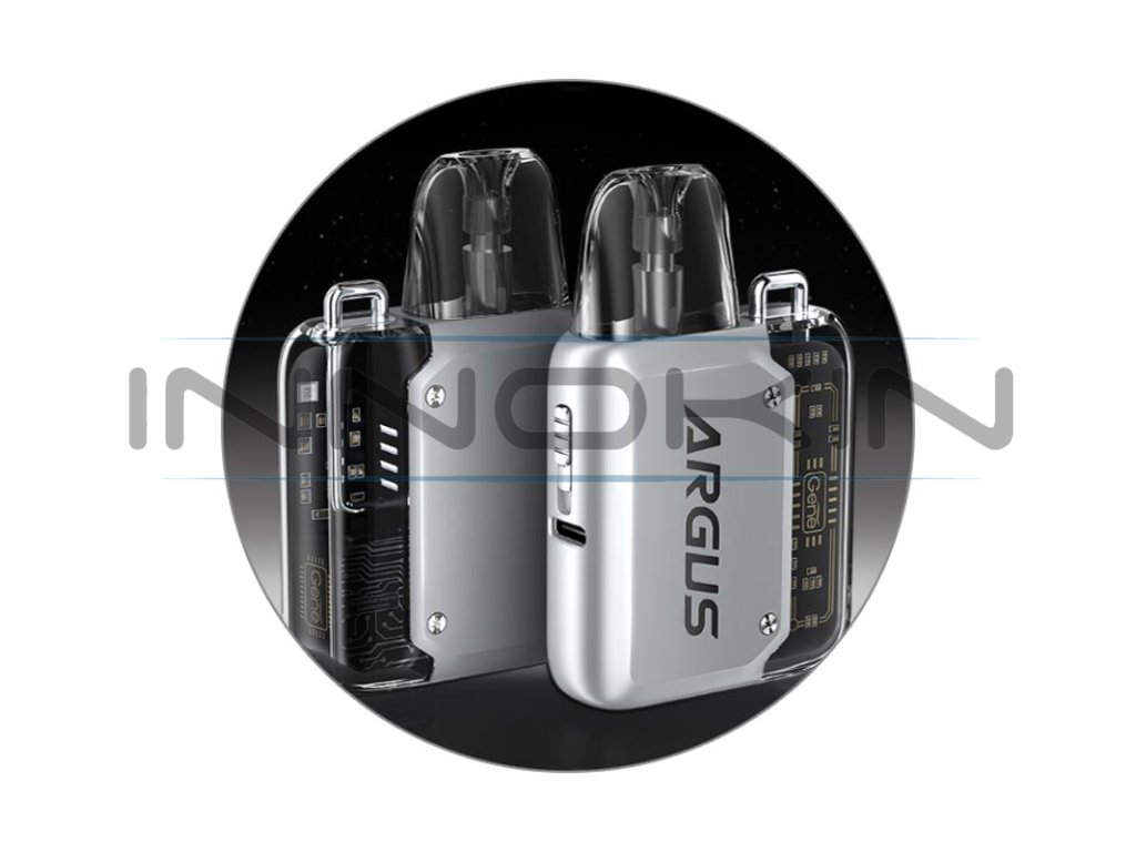Futuristický design, prvotřídní výkon, extrémně rychlé nabíjení a inovativní čipset - VooPoo Argus P1 Pod Kit je stylová a luxusně zpracovaná elektronická cigareta typu pod, která padne přesně do kapsy. Na první pohled zaujme zejména svým futuristickým zpracováním. Jedna polovina těla nabídne kovovou konstrukci ze zinkové slitiny, přičemž druhá polovina disponuje polykarbonátovým transparentním krytím, můžete tak nahlédnout do vnitřní struktury celé e-cigarety a během užívání si bez problému prohlížet také celý čipset. Tělo je osazeno čipem GENE.AI 1.2, který přináší řadu inovativních funkcí v čele s automatickým spínáním potahu a automatickým nastavením intenzity potahování na základě tlaku vyvíjenému během potahu. Díky této technologii pracuje celé zařízení mnohem efektivněji a zachovává si delší životnost baterie.