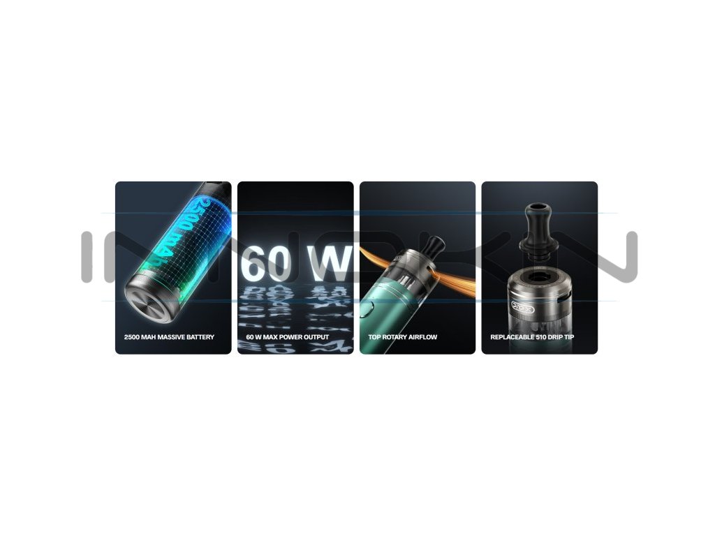 Není určeno pro náplně obsahující nikotin! Doric 60 Pro Vás zaujme svým elegantním válcovým designem, který je vyroben z prémiového hliníku a poskytuje tak vynikající odolnost a lehkost. Zařízení je ideální jak pro úplné začátečníky, tak i pro zkušené vapery, kteří hledají řešení DTL & MTL vapingu. Tělo baterie disponuje monočlánkem o kapacitě 2500mAh s USB-C portem. Čip GENE TT 2.0 dodává až 60W výkonu ve třech stupních - MINIMUM / OPTIMAL / MAXIMUM s LED zobrazením. Spodní část baterie je opatřena důmyslným uzamčením proti nechtěnému sepnutí baterie nebo jako dětská pojistka. Tvorbu páry zajišťuje spínací tlačítko nebo systém automatického žhavení - stačí pouze potáhnout z náustku. Cartridge PnP X se stejnojmennou žhavicí hlavou pojme až 5ml vašeho oblíbeného liquidu. V základním balení budete mít na výběr dvě žhavicí hlavy, a to PnP X o odporu 0,3ohm a PnP X o odporu 0,6ohm.