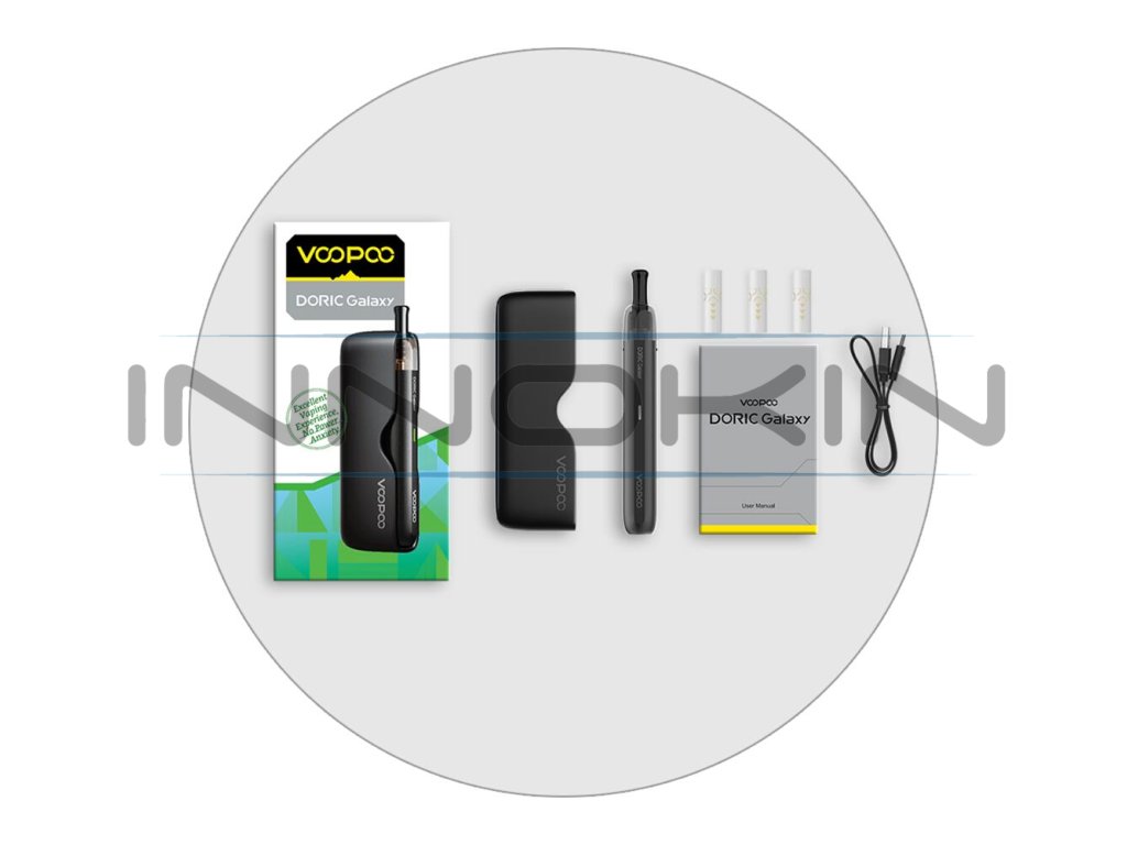 VooPoo Doric Galaxy PCC je kompletní souprava kompaktní e-cigarety typu pen-style a dobíjecího pouzdra s vlastní přídavnou baterií. V těle e-cigarety se nachází tradiční integrovaná baterie s kapacitou 500 mAh, k té se přidává také integrovaná baterie uvnitř pouzdra s kapacitou 1800 mAh. Po spojení obou těchto součástí získáte elegantní a moderní e-cigaretu s obrovskou výdrží a jedinečným designem.