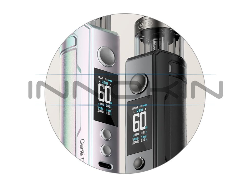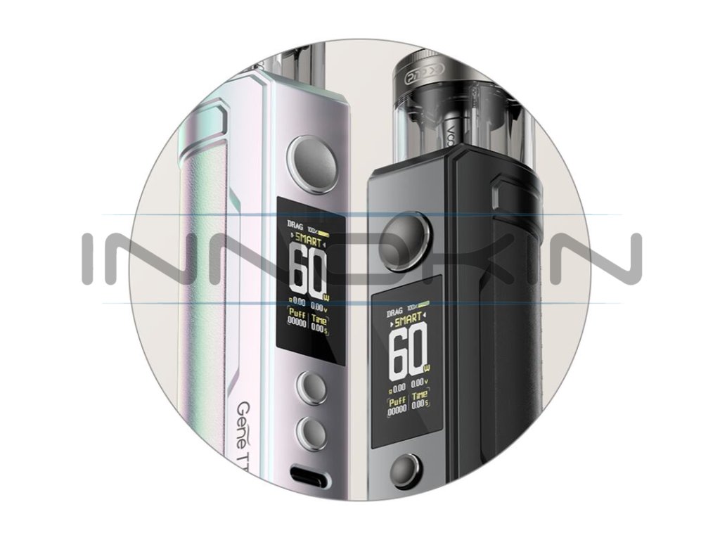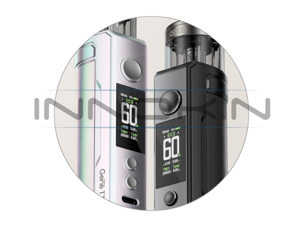 V jádru e-cigarety se nachází upgradovaný čipset Gene.TT 2.0, který nabídne perfektní výsledky při používání a přehledné uživatelské rozhraní. Všechny potřebné funkce ovládáte pomocí panelu v přední části, který tvoří ovládací tlačítka a velký barevný displej. E-cigareta pracuje hned se třemi výstupními režimy, pro příznivce jednoduchého provozu je připraven režim SMART, který nastaví výkon automaticky za vás a zároveň omezí rozsah regulovaného výkonu, aby nedošlo k poškození hlavy. Pro pokročilejší uživatele je připraven režim RBA pro vlastní regulaci výkonu v libovolném rozpětí mezi 5 - 60 W a nový režim ECO, který prodlouží životnost vaší baterie. Ve spojení s novým typem cartridge PnP-X s objemem 5 ml a novými hlavami PnP-X se jedná o vynikající DL zařízení pro náročné, které ocení také naprostí začátečníci.
