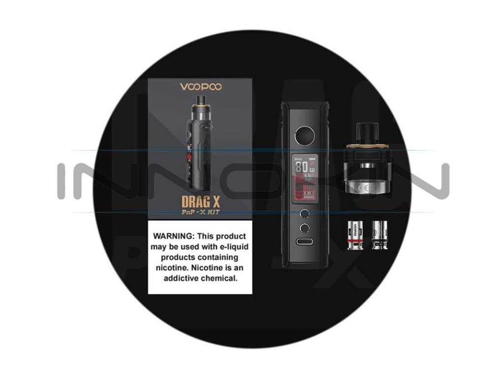 Obsah balení: 1x zařízení VooPoo Drag X 1x cartridge VooPoo PnP-X Pod (5 ml) 1x žhavící tělísko VooPoo PnP-VM1 (0,3 ohm) 1x žhavící tělísko VooPoo PnP-VM6 (0,15 ohm) 1x USB-C kabel pro dobíjení 1x uživatelský manuál * Baterie typu 18650 není součástí balení. |