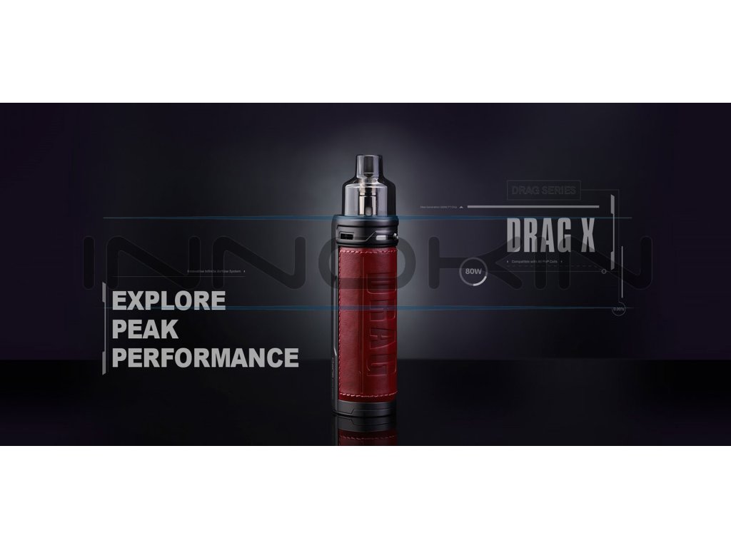 Samotný Grip je vyroben z kvalitní zinkové slitiny. Na zadním panelu se nachází kůže, která je velmi pěkným designovým a na omak příjemným doplňkem. Sdrcem podu Drag X je zbrusu nový chipset GENE.TT, se kterým dokáže tato cigareta dosáhnout například okamžitého náběhu žhavení, a to neuvěřitelnou rychlostí 0,001s. Voopoo Drag X dále disponuje řadu bezpečnostních prvků, jakými jsou například ochrana proti zkratu, přebití, vypnutí žhavení při dlouhém nechtěném stisku 10s, ochrana proti přehřátí aj.