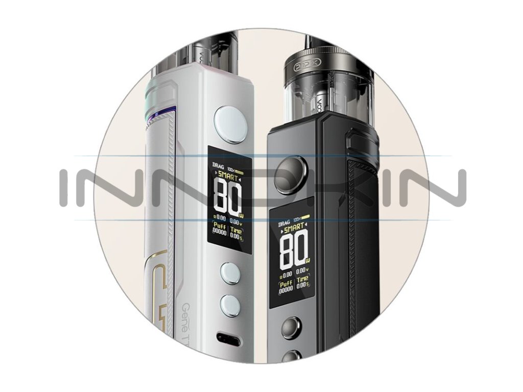 V jádru e-cigarety se nachází upgradovaný čipset Gene.TT 2.0, který nabídne perfektní výsledky při používání a přehledné uživatelské rozhraní. Všechny potřebné funkce ovládáte pomocí panelu v přední části, který tvoří ovládací tlačítka a velký barevný displej. E-cigareta pracuje hned se třemi výstupními režimy, pro příznivce jednoduchého provozu je připraven režim SMART, který nastaví výkon automaticky za vás a zároveň omezí rozsah regulovaného výkonu, aby nedošlo k poškození hlavy. Pro pokročilejší uživatele je připraven režim RBA pro vlastní regulaci výkonu v libovolném rozpětí mezi 5 - 80 W a nový režim ECO, který prodlouží životnost vaší baterie. Ve spojení s novým typem cartridge PnP-X s objemem 5 ml a novými hlavami PnP-X se jedná o vynikající DL zařízení pro náročné, které ocení také naprostí začátečníci.
