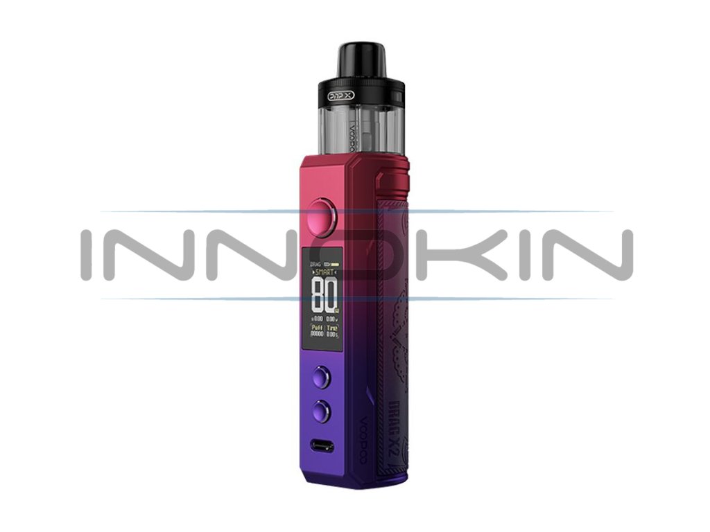 Druhá generace populárních modelů e-cigaret Voopoo Drag S a Drag X přináší celou řadu vylepšení v čele s upgradovaným čipsetem, přepracovaným rozhraním, podporou většího množství režimů, větším objemem a novou platformou PnP-X pro co nejlepší výsledky při vapování. Verze VooPoo Drag X2 Pod Kit nabídne elegantní a moderně zpracované tělo ze zinkové slitiny a kůže. Samozřejmostí jsou potom opět praktické rozměry a ergonomicky zaoblené hrany v zadní části pro komfortní stisk v dlani. Tělo zařízení ukrývá slot pro vlastní baterii typu 18650. Díky pohonu na externí baterii si dokáže model Drag X2 poradit s výstupním výkonem až 80 W. Externí baterii potom můžete pohodlně dobíjet také přímo v těle e-cigarety díky USB-C portu s podporou 2A nabíjení v přední části.