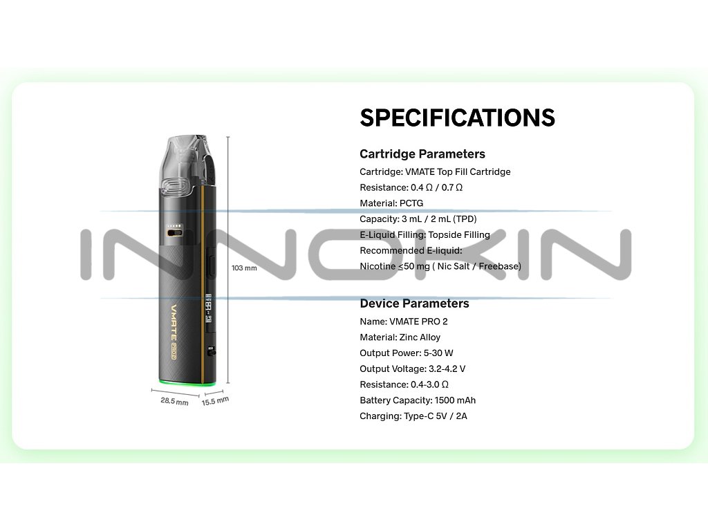 Parametry a specifikaceRozměry: 103 x 28,5 x 15,5 mm Kapacita baterie: 1500 mAh Režimy: POWER / ECO Metody spínání potahu: automatické Výstupní napětí: 3,2 - 4,2 V Výstupní výkon: 5 - 30 W Podporovaný odpor: 0,4 - 3,0 Ω Způsob nabíjení: USB-C port (5V / 2A) Regulace výkonu: ano (v POWER režimu) Objem Pod Cartridge: 2 ml Styl potahování: MTL / RDL Odpor žhavících hlav: 0,4Ω / 0,7Ω Regulace přívodu vzduchu (Airflow): ano Hmotnost: 43g Barva: Space Grey (Šedá) Materiál: zinková slitina + PCTG |