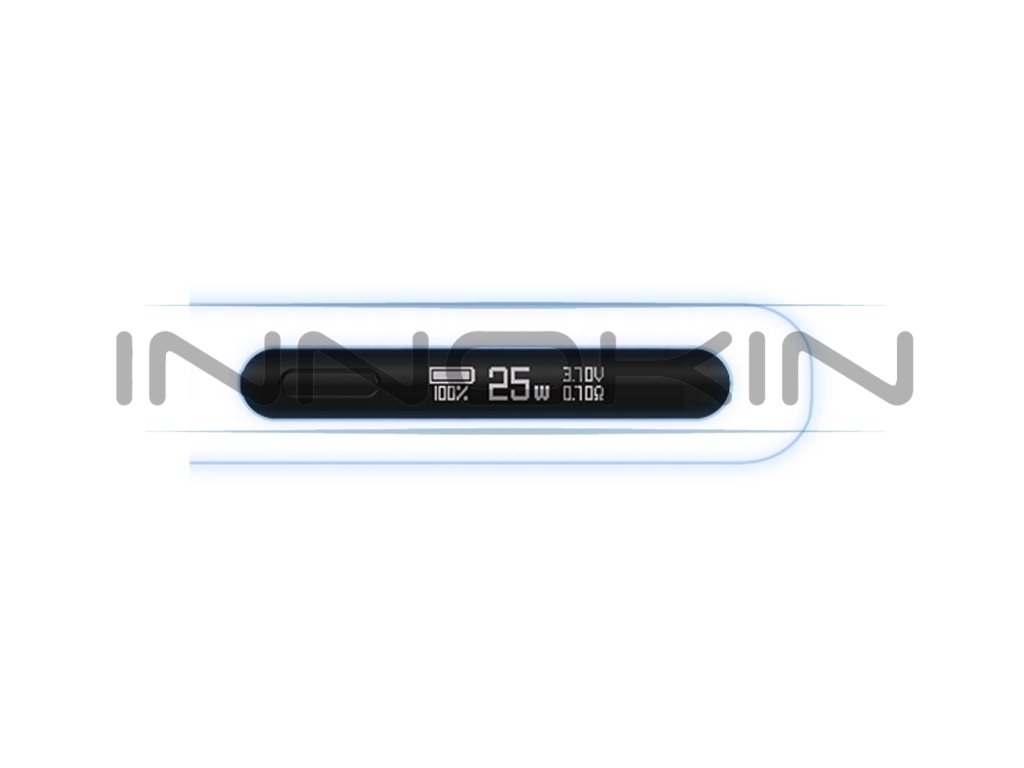 V boční části se nachází přehledný a jasný OLED displej se stručným a uživatelsky přívětivým rozhraním. Displej vás informuje o aktuálním stavu baterie, výstupním napětí, odporu cartridge a o nastaveném výkonu. Ten je možné regulovat v rozpětí 5 - 25 W. Výkon si navíc nastavíte pomocí jediného tlačítka, celkové nastavení je tak nesmírně rychlé a intuitivní.
