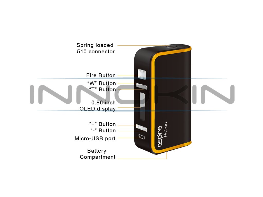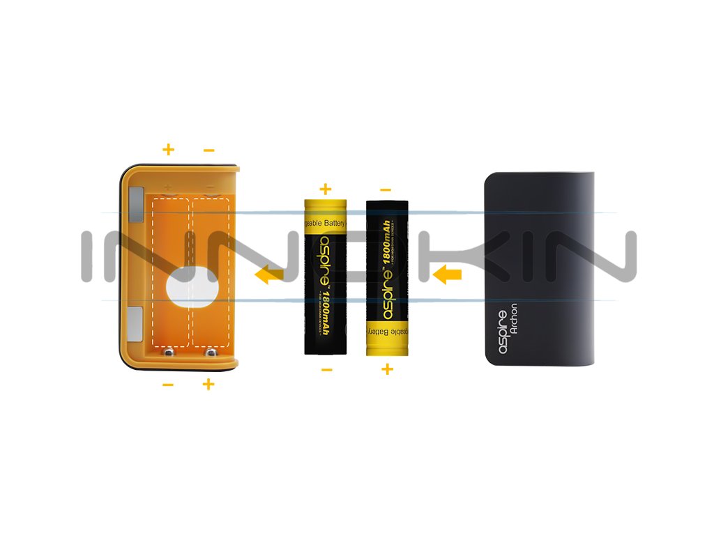 Aspire Archon je nový výkonný 150W mod na dvě 18650 baterie. Umožňuje přizpůsobit si uvítací logo pomocí několika kliků přímo na módu. Má dětskou ochranu a upgradovatelný firmware. Umožňuje přepnutí mezi VW a TC režimem pomocí jednoho tlačítka. Kryt baterií je uchycen magnety. Vzhledově atraktivní barevné kombinace, ergonomický tvar.