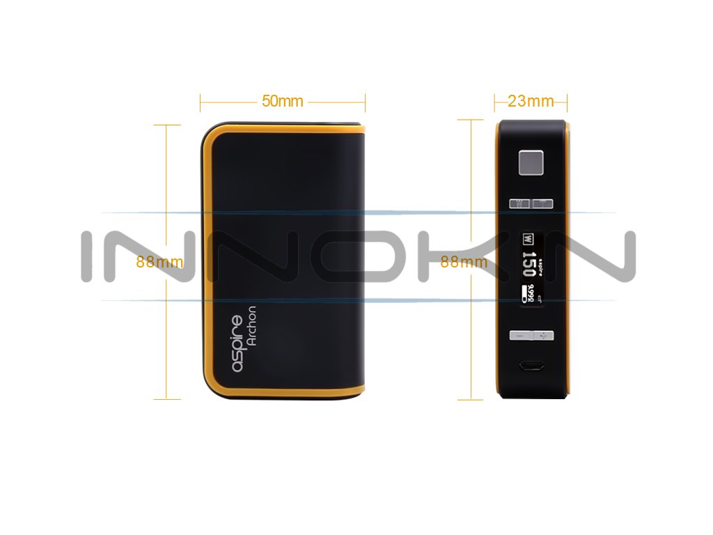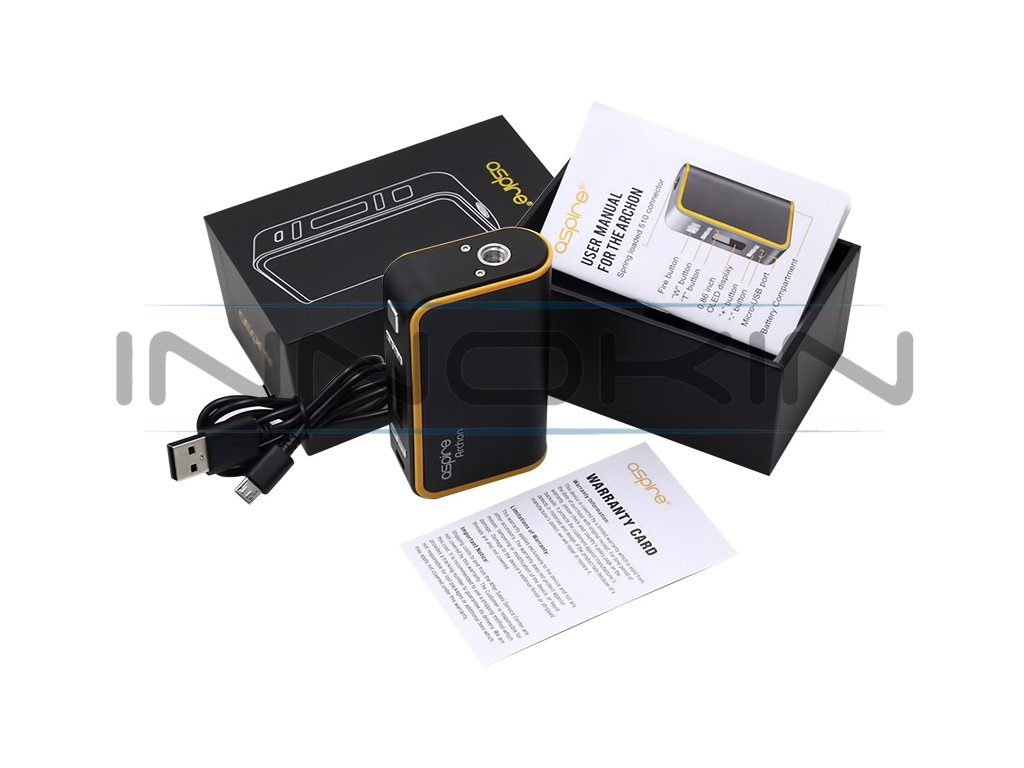 Aspire Archon je nový výkonný 150W mod na dvě 18650 baterie. Umožňuje přizpůsobit si uvítací logo pomocí několika kliků přímo na módu. Má dětskou ochranu a upgradovatelný firmware. Umožňuje přepnutí mezi VW a TC režimem pomocí jednoho tlačítka. Kryt baterií je uchycen magnety. Vzhledově atraktivní barevné kombinace, ergonomický tvar.