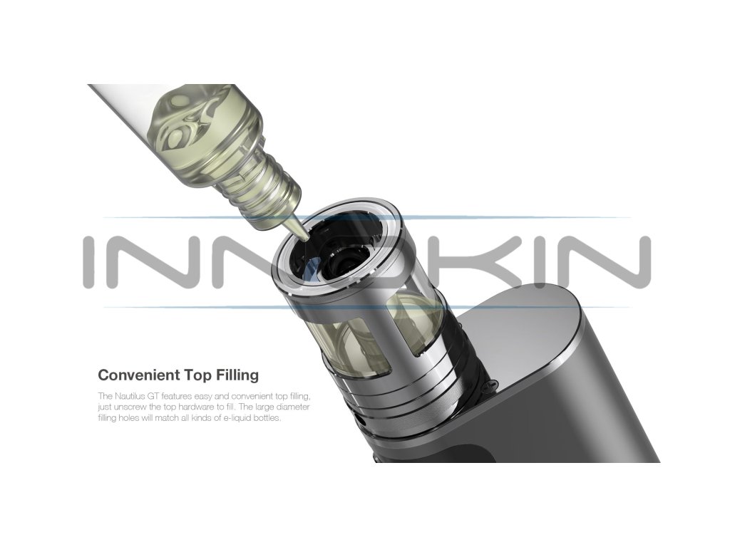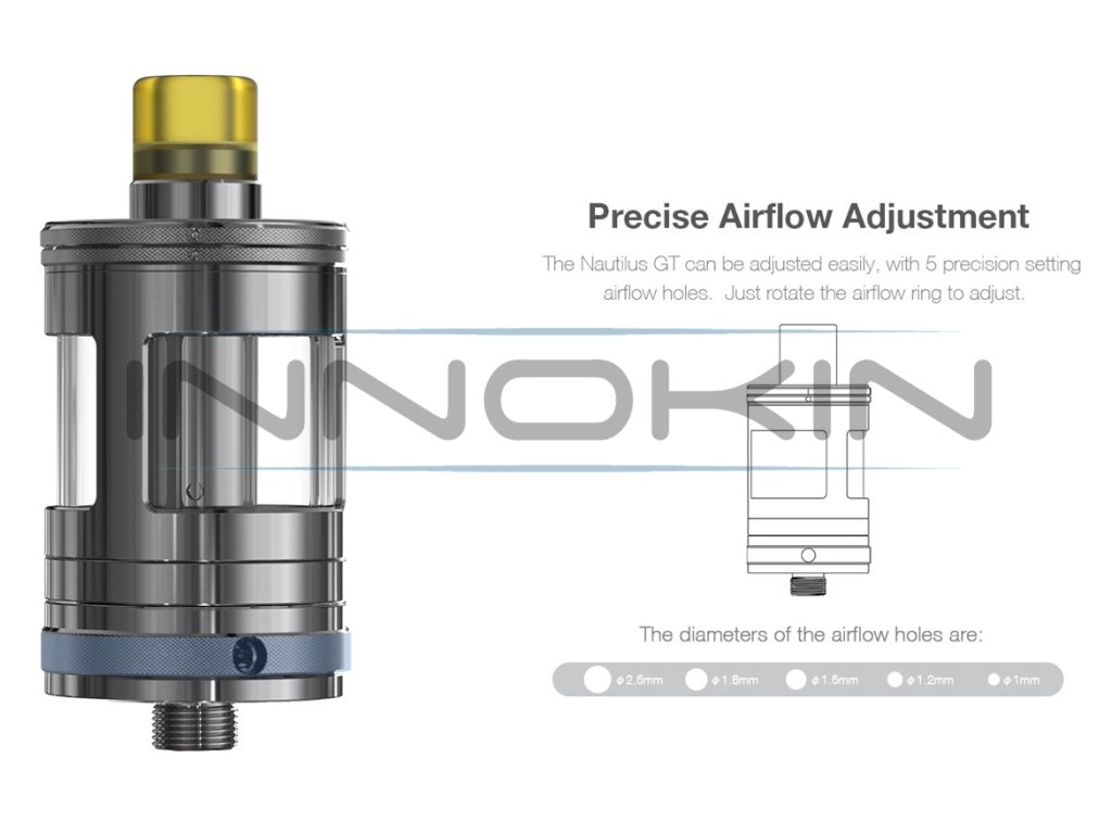 Clearomizer aSpire Nautilus GT je postaven na kvalitní základně z ušlechtilé oceli, která je doplněna o kvalitní pyrexové sklo. Celkový objem pro náplň tak činí až 3ml zásobního prostoru. Nastavitelný přívod vzduchu (Airlow) je samozřejmostí, a to v dokonalém provedení, které je přesně odstupňované celkem čtyřmi různě velikými průchody. Průchod vzduchu může být také celkově uzavřen. Díky tomu to provedení je Nautilus GT primárně určen pro oblíbený styl přímého potahování DL, nicméně v kombinaci se správně zvolenou žhavící hlavou a při vyšším omezení přívodu vzduchu lze snadno použít i pro klasický styl MTL, kdy potahujete jako z klasické cigarety. Vše završuje tolik oblíbený systém horního plnění, kdy stačí pootočit horní částí Clearomizeru a jednoduchým způsobem jí vytáhnout. K dispozici jsou dva dostatečně velké plnící otvory, kterými se plnění stane rychlou a jednoduchou záležitostí. K případné výměně žhavící hlavy stačí odšroubovat spodní základnu a samotné výměně už nic nebrání.