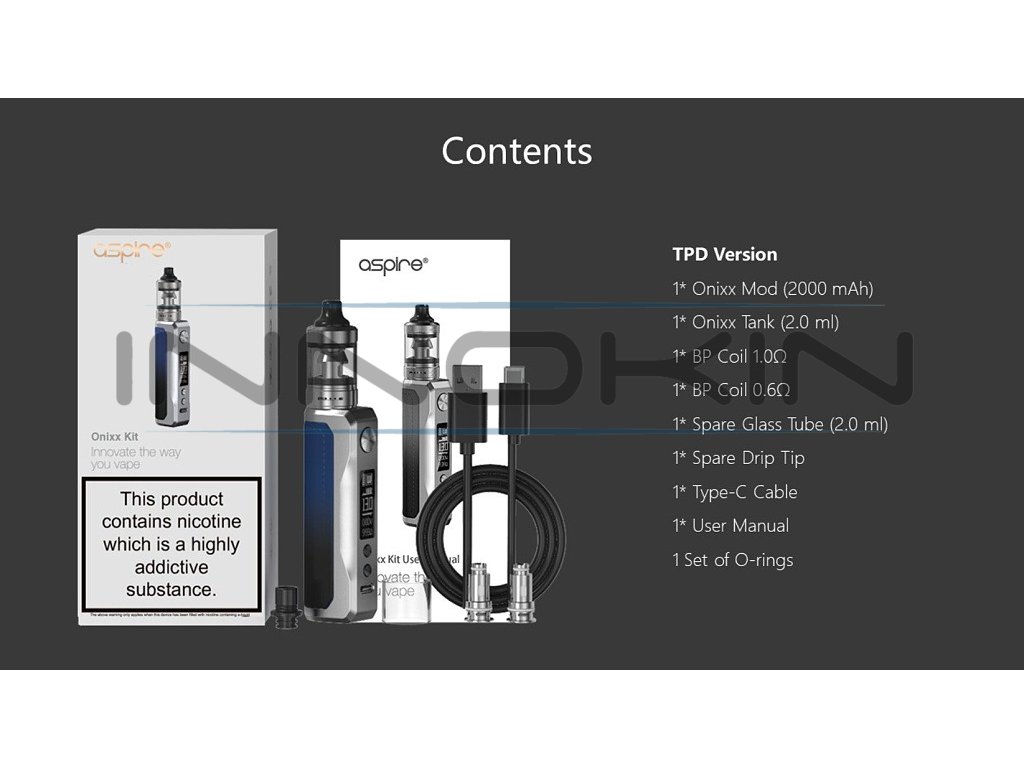 Nádherně zpracovaný elektronický grip ze zinkové slitiny od firmy Aspire, v SETU s Clearomizerem Onixx s kapacitou 2ml, který je vhodný jak pro MTL, tak i DL vapování. Maximální výkon 40W, rychlé USB-C nabíjení, integrovaná baterie s velkou kapacitou 2000mAh, ASP Chipset, OLED displej 0.87”, podpora režimu VW, závit 510.