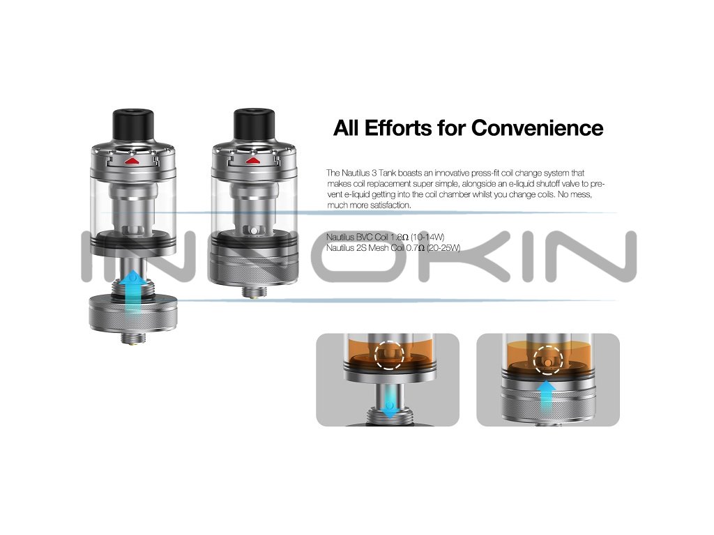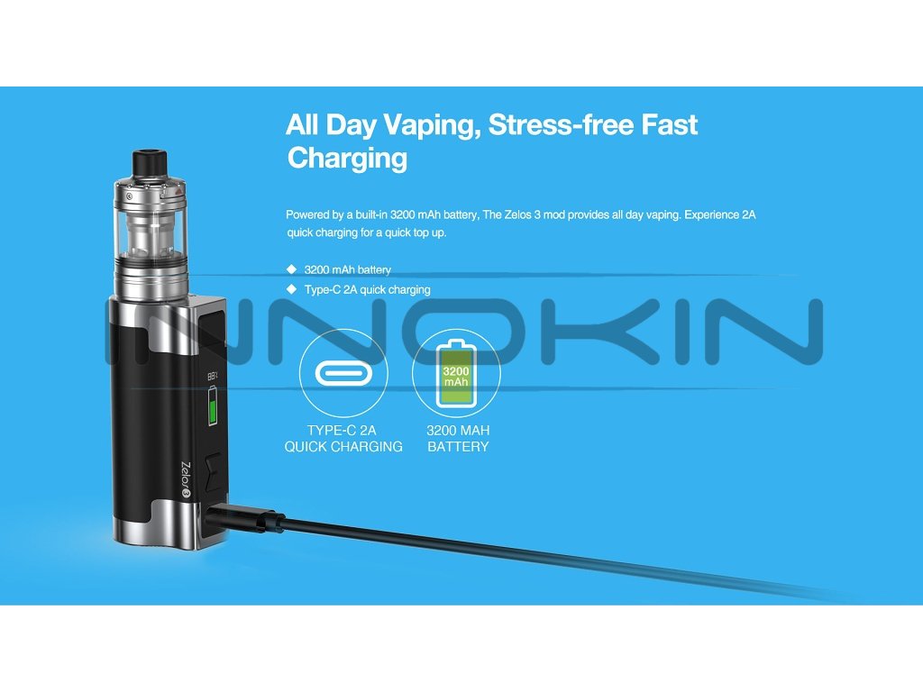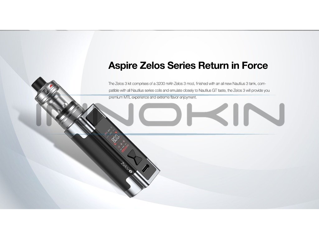 Výkonný SET Gripu Aspire Zelos 3 a Clearomizeru Aspire Nautilus 3, vyrobený z lehké zinkové slitiny, disponující vestavnou baterií s vynikající kapacitou 3200mAh. Nastavitelný výkon 1-80W, režimy VW, VV, Bypass, TC, TCR, CPS. Objem Clearomizéru 2ml, propracované Airflow, možnost použití jak MTL, tak DL, podpora žhavících hlav Nautilus BVC, 2x žhavící hlava v SETU.