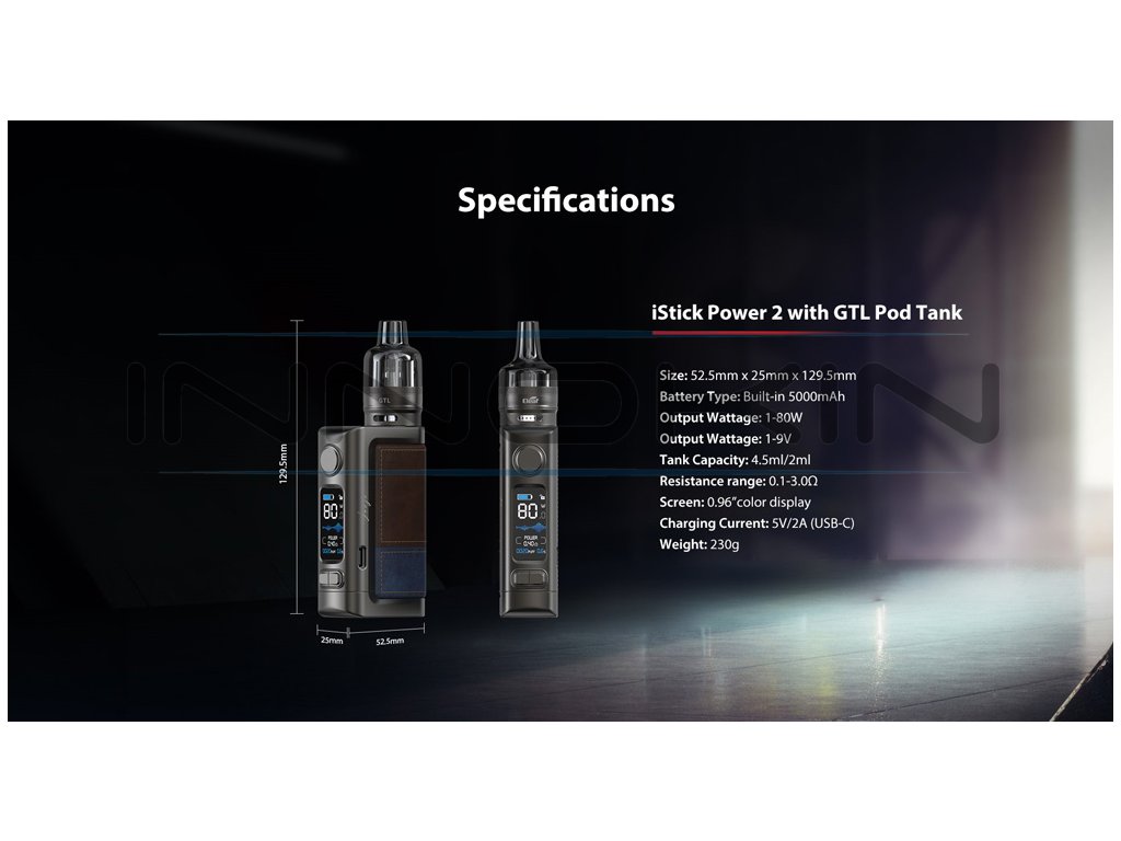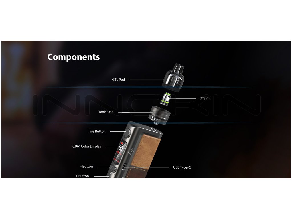 Výkonný a velmi elegantní Grip v setu s vynikajícím Pod Clearomizérem GTL o objemu 4,5ml s plynulou regulací Airflow. Integrovaná baterie s vysokou kapacitou baterie 5000mAh, barevný TFT 0,96 palcový displej s detailními informacemi o průběhu vapování. Nastavitelný výkon 1W-80W, režimy VW, VV, Smart, USB-C nabíjení.