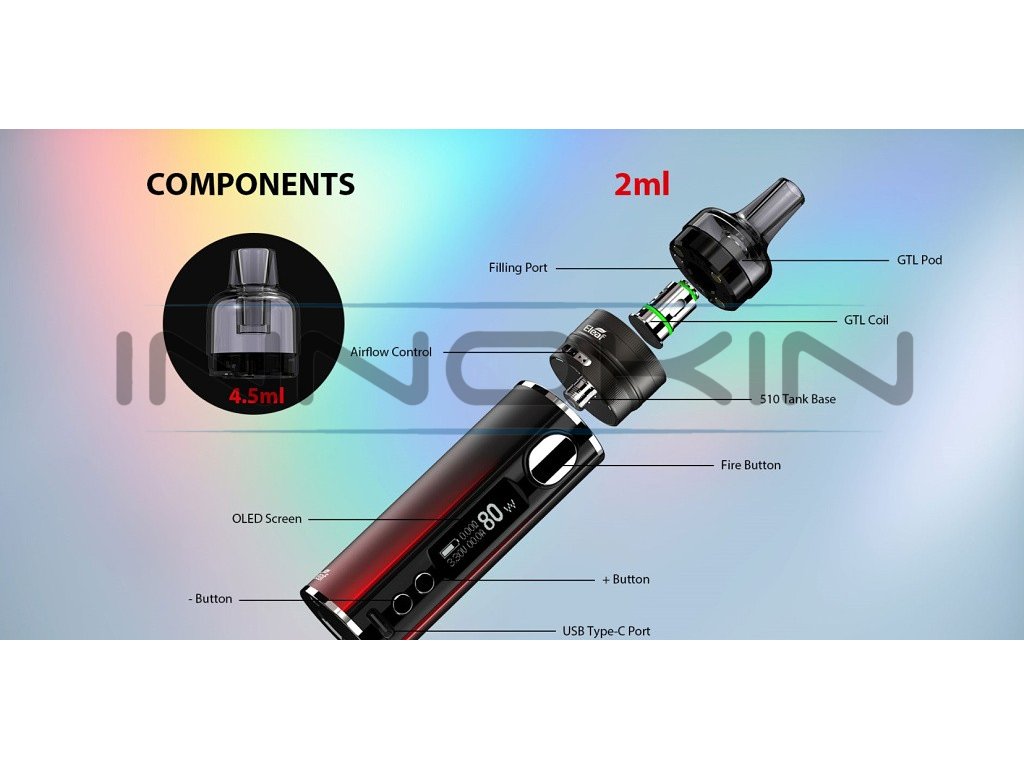 Oblíbený Eleaf iStick T80 ve zcela novém barevném provedení se zcela novým Pod Clearomizérem Eleaf GTL. Vestavěná baterie o kapacitě 3000mAh, rychlé USB-C QC3.0 nabíjení, vysoký výkon až 80W, OLED displej, ochrana proti zkratu, přehřátí, přežhavení, nízkému odporu, 10-ti vteřinová ochrana žhavení. Clearomizér GTL Pod se závitem 510, objem 4,5ml, regulace Airflow, vhodný pro DL vapování, 2x žhavící hlava Eleaf GTL v SETU. Barevné provedení Black Afterglow.