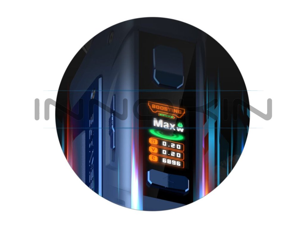 V těle modu se ukrývá slot pro vložení dvou externích baterií. Postačí jen odklopit víčko ve spodní části a vložit své vlastní baterie typu 21700, nebo 18650 s přiloženou redukcí. Díky pohonu na dvě baterie si mod poradí s ohromujícím výstupním výkonem a dodá vždy perfektní výsledky při vapování. Baterie si budete moci navíc pohodlně dobíjet přímo v modu připojením dobíjecího kabelu typu USB-C.
