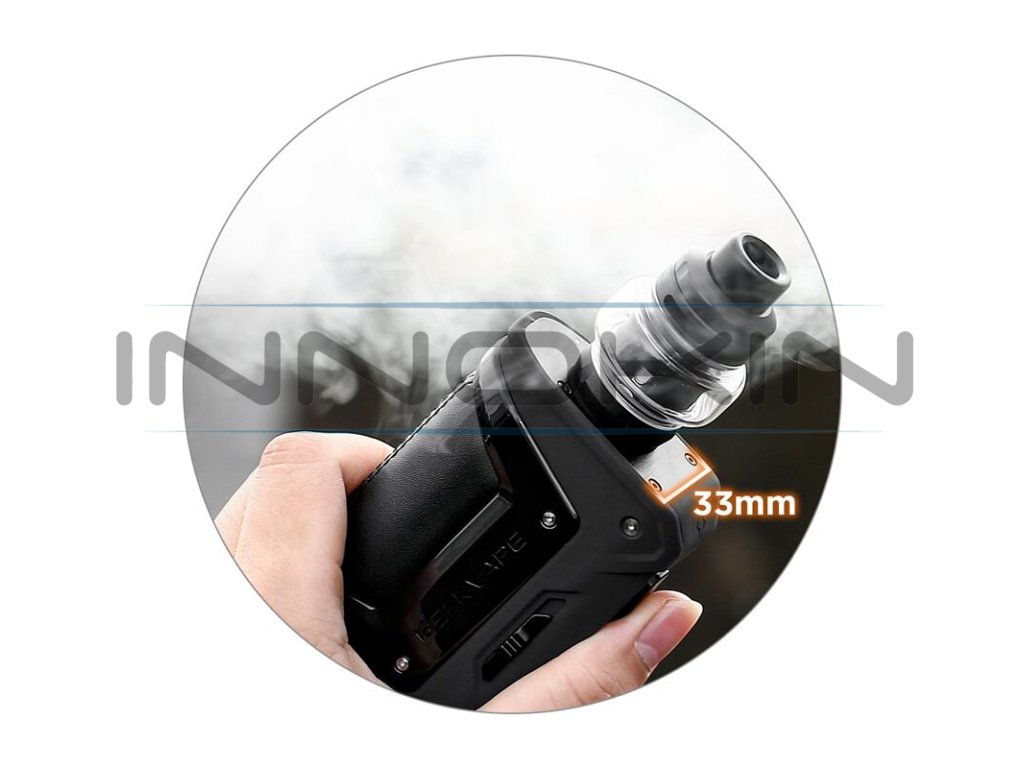 Vrchní část modu disponuje závitem typu 510, pro atomizéry si potom výrobce připravil širokou základnu s průměrem 33 mm. Bez problému ho tak osadíte i průměrově silnějšími atomizéry bez vzniku nevzhledných přesahů po stranách modu. Grip L200 Classic je kompatibilní se všemi rozšířenými a běžně užívanými typy atomizérů se stejným uchycením závitu.