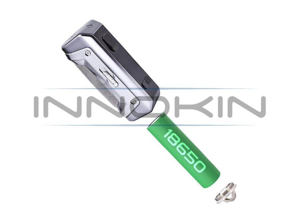 Ve spodní části se nachází šroubovací uzávěr, který ukrývá slot pro jednu baterii typu 18650. Po vložení baterie je možné začít využívat mod naplno. Díky pohonu na jednu externí baterii je zajištěn vysoký výstupní výkon a rychlý náběh žhavení. Baterie není součástí balení a je nutné dokoupit ji k modu samostatně. Baterii 18650 je možné dobíjet přímo v modu díky USB-C portu na těle.