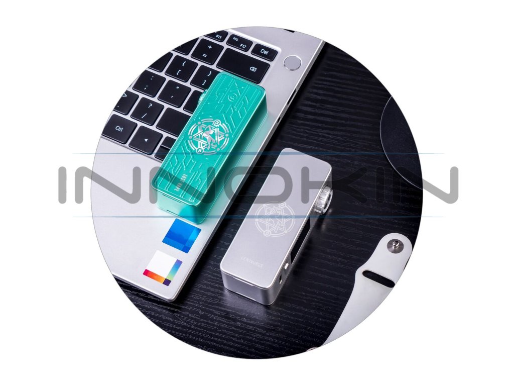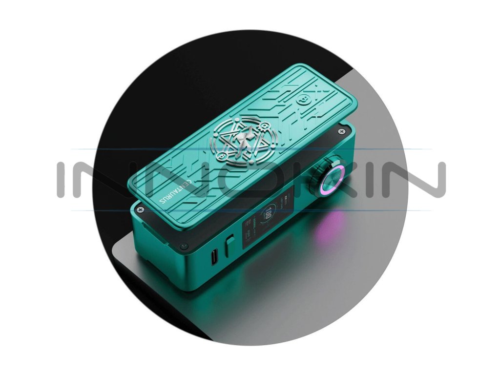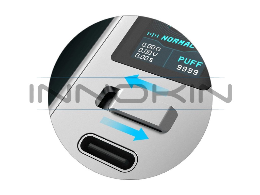Po odklopení bočního panelu modu Centaurus M100 objevíte slot pro vložení vlastní baterie typu 18650. Díky pohonu na externí baterii si mod dokáže poradit s ohromujícím výstupním výkonem, jenž se zastavil až na 100W. Svou vlastní baterii budete moci pohodlně nabíjet přímo v modu, grip M100 disponuje slotem pro připojení kabelu USB-C a pro rychlé dobití proudem až 2A.