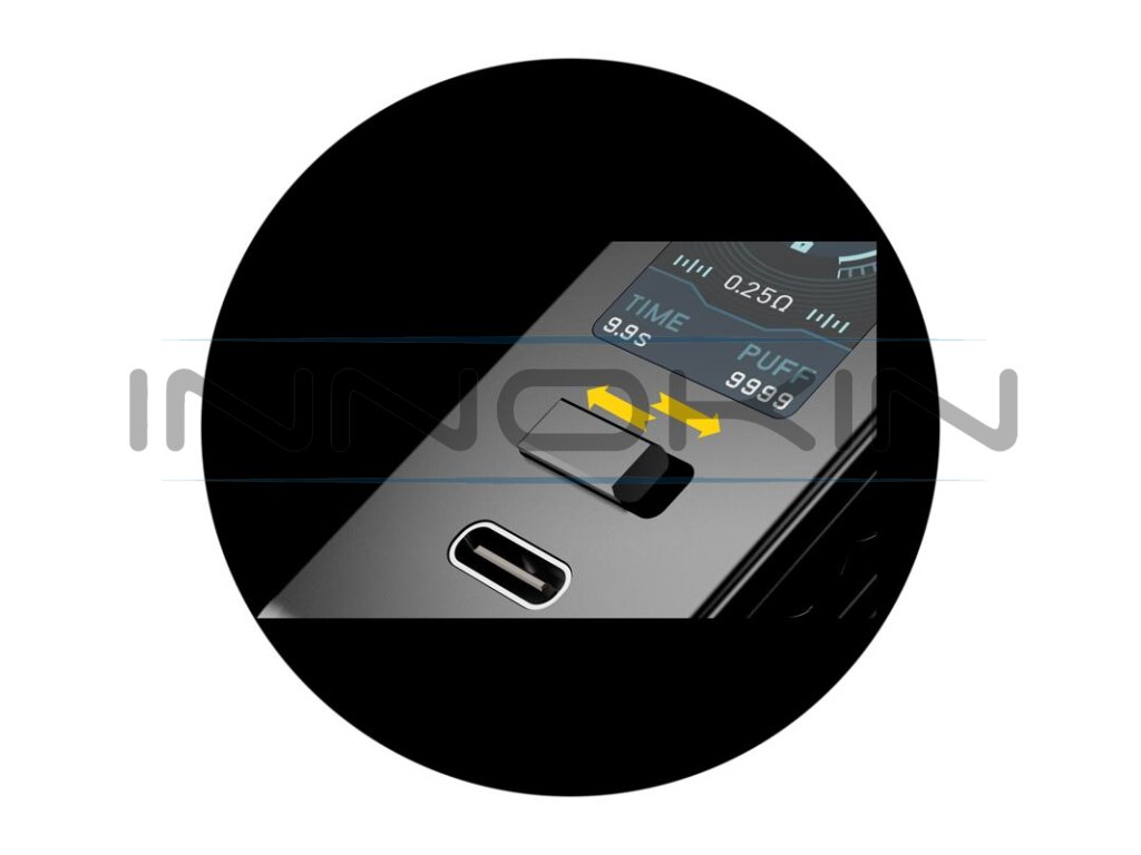 Zajímavým prvkem, který značně usnadní každodenní používání a přenášení e-cigarety, je přítomnost manuálního vypínače na předním panelu. Pro zapnutí, či vypnutí už tak nebudete muset hledat kombinace stisku spínacího tlačítka. Jednoduše posunete posuvník doprava, nebo doleva a budete mít e-cigaretu ihned připravenou k provozu, nebo k cestování.