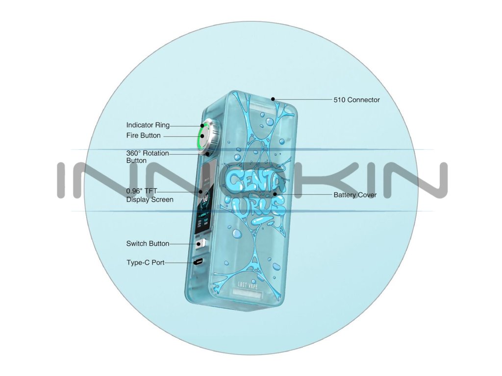 Lost Vape Centaurus N100 Mod je praktický jednobaterkový grip kombinující jedinečný styl a prvotřídní funkce díky osvědčenému čipsetu Quest 2.0. Semitransparentní konstrukce z kombinace polykarbonátu, zinkové slitiny a nerezové oceli působí futuristickým a elegantním dojmem, mod se navíc snadno užívá díky inovativnímu tlačítku s otočným kolečkem a funkcí 4v1. Díky podpoře bateriových článků 21700 nebo 18650 dodá perfektní výsledky a postará se o strhující výkon až 100 W. Se závitem 510 v horní části si potom poradí libovolný atomizér se stejným typem uchycení. Ať jste milovníky DIY vapingu nebo preferujete klasické tovární hlavy, mod si jednoduše osadíte vlastním atomizérem se závitem 510 a můžete se pustit do vapování a vychutnat si veškeré kvality kompaktního modu N100.