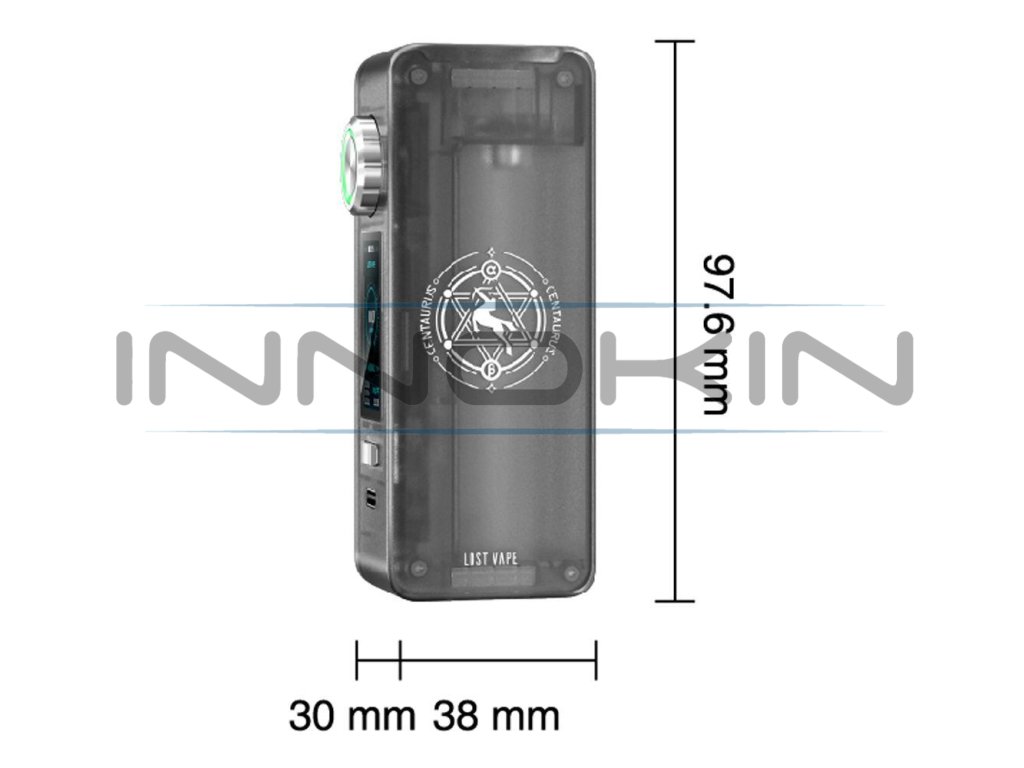 Lost Vape Centaurus N100 Mod je praktický jednobaterkový grip kombinující jedinečný styl a prvotřídní funkce díky osvědčenému čipsetu Quest 2.0. Semitransparentní konstrukce z kombinace polykarbonátu, zinkové slitiny a nerezové oceli působí futuristickým a elegantním dojmem, mod se navíc snadno užívá díky inovativnímu tlačítku s otočným kolečkem a funkcí 4v1. Díky podpoře bateriových článků 21700 nebo 18650 dodá perfektní výsledky a postará se o strhující výkon až 100 W. Se závitem 510 v horní části si potom poradí libovolný atomizér se stejným typem uchycení. Ať jste milovníky DIY vapingu nebo preferujete klasické tovární hlavy, mod si jednoduše osadíte vlastním atomizérem se závitem 510 a můžete se pustit do vapování a vychutnat si veškeré kvality kompaktního modu N100.