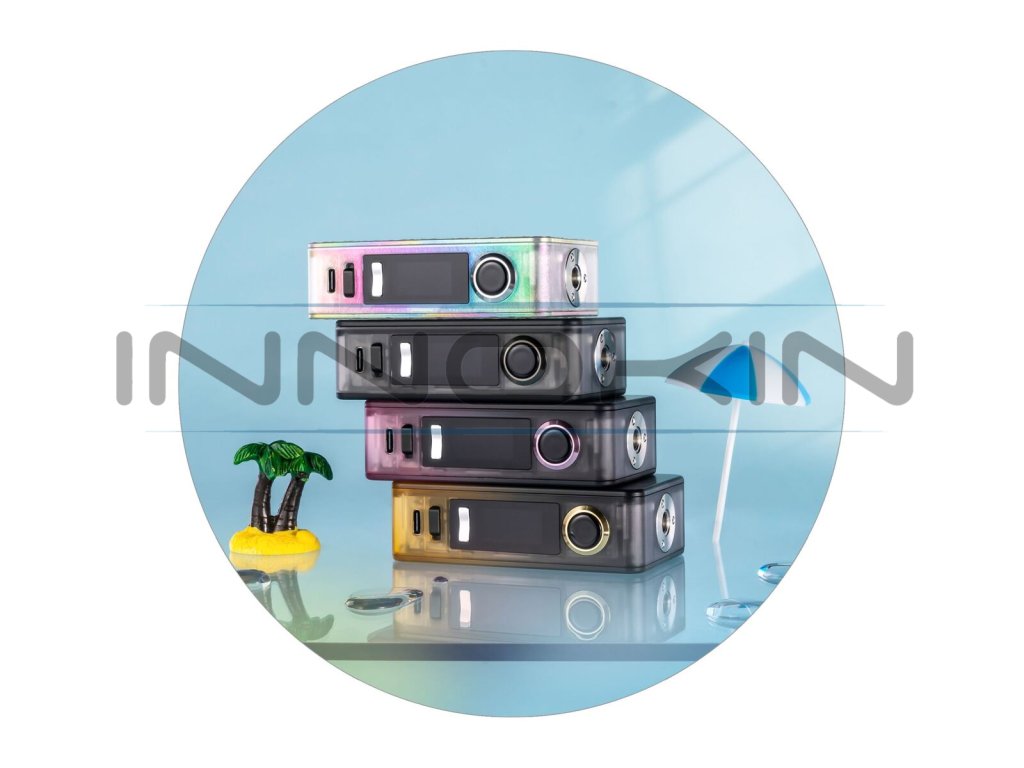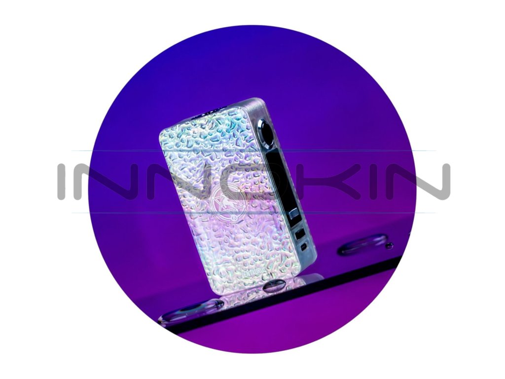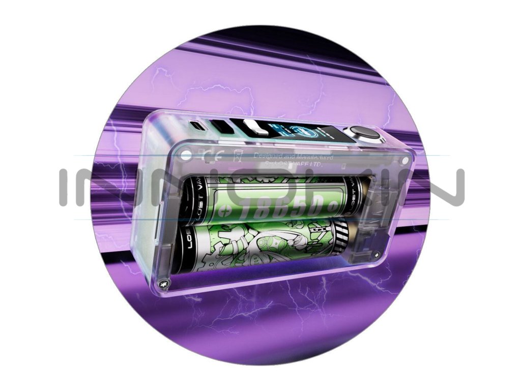 Boční panel modu ukrývá slot pro vložení dvou externích baterií typu 18650. Díky pohonu na dvě baterie si dokáže mod poradit s ohromujícím výkonem a zároveň dodat vždy skvělé a co nejoptimálnější výsledky při vapování. Samozřejmostí je také praktická podpora nabíjení baterií přímo v modu. Tělo modu je vybaveno portem USB-C a mod podporuje nabíjení 2A.