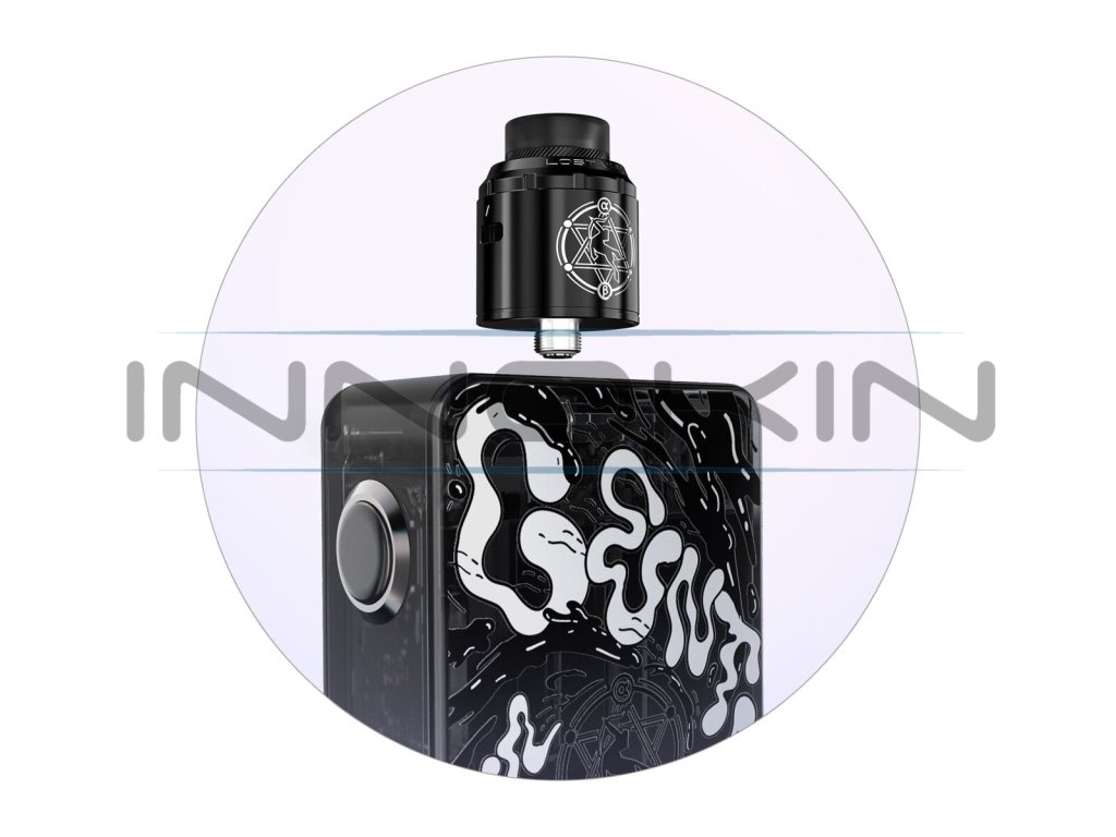 Ve vrchní části modu se nachází tradiční závit typu 510, díky čemuž je mod kompatibilní s drtivou většinou atomizérů na současném trhu. Hravě si poradí jak s tradičními atomizéry na tovární žhavící hlavy, tak také s DIY atomizéry pro vlastní spirálky. Horní část nedisponuje žádným zkosením, pro instalaci vašeho atomizéru tak máte dostatek prostoru a nemusíte se obávat nevzhledných přesahů ani u průměrově silnějších atomizérů.