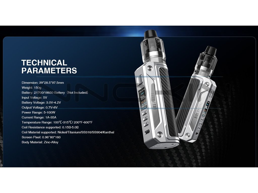 Elektronický grip Lost Vape Thelema Solo 100W je napájen jednou baterií 21700, nebo 18650 a disponuje maximálním výkonem 100 W (s baterií 21700) (baterie nejsou součástí balení). Samotný Mod je vybaven čipem Modern Quest 2.0 s několika ochranami a 0,96 palcovým barevným TFT displejem se 6 barevnými schématy, který se snadno ovládá. Lost Vape Thelema Solo podporuje režimy VW/ Power/ TC-SS994/ TC-SS316/ TC-Ni/ TC-Ti/ VPC/ Bypass, které vyhovují různým potřebám. Thelema Solo je navíc kompatibilní s tanky se závitem 510 až do průměru 28 mm.