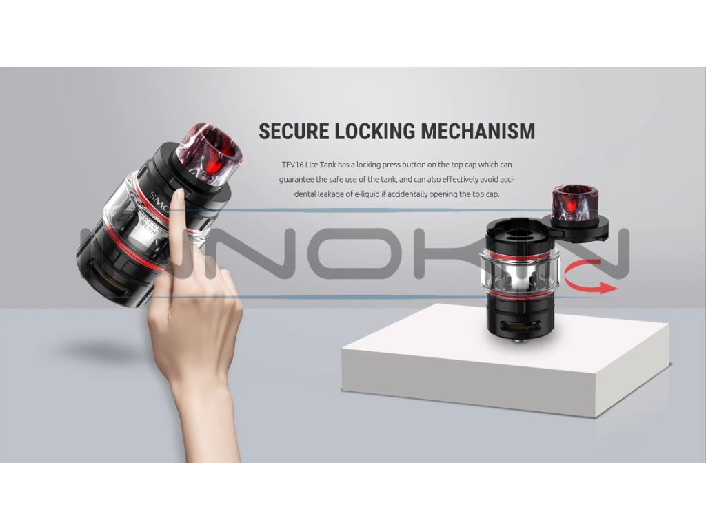 Samotnou kapitolu pak představuje Nízkoodporový Tank clearomizer Smok TFV16 Lite, který je součástí tohoto setu. Clearomizer Smoktech TFV16 disponuje objemem celých 5ml zásobního prostoru pro e-liquid. Zároveň s tímto clearomizerem přichází zcela nové žhavící hlavy nesoucí stejné označení TFV16, které jsou osazeny hitem poslední doby, a to Mesh spirálkami, díky kterým se dá dosáhnout opravdu velké produkce páry. Samozřejmostí je pak možnost regulace přívodu vzduchu. Průchod může být také téměř celkově uzavřen. Díky tomu to provedení je Smok TFV16 primárně určen pro oblíbený styl přímého potahování DL, nicméně v kombinaci se správně zvolenou žhavící hlavou a při vyšším omezení přívodu vzduchu lze snadno použít i pro klasický styl MTL, kdy potahujete jako z klasické cigarety. Plnění e-liquidem je rovněž velmi praktické a probíhá pootočením horní části clearomizeru proti směru hodinových ručiček, kde se skrývá samotný otvor pro plnění.