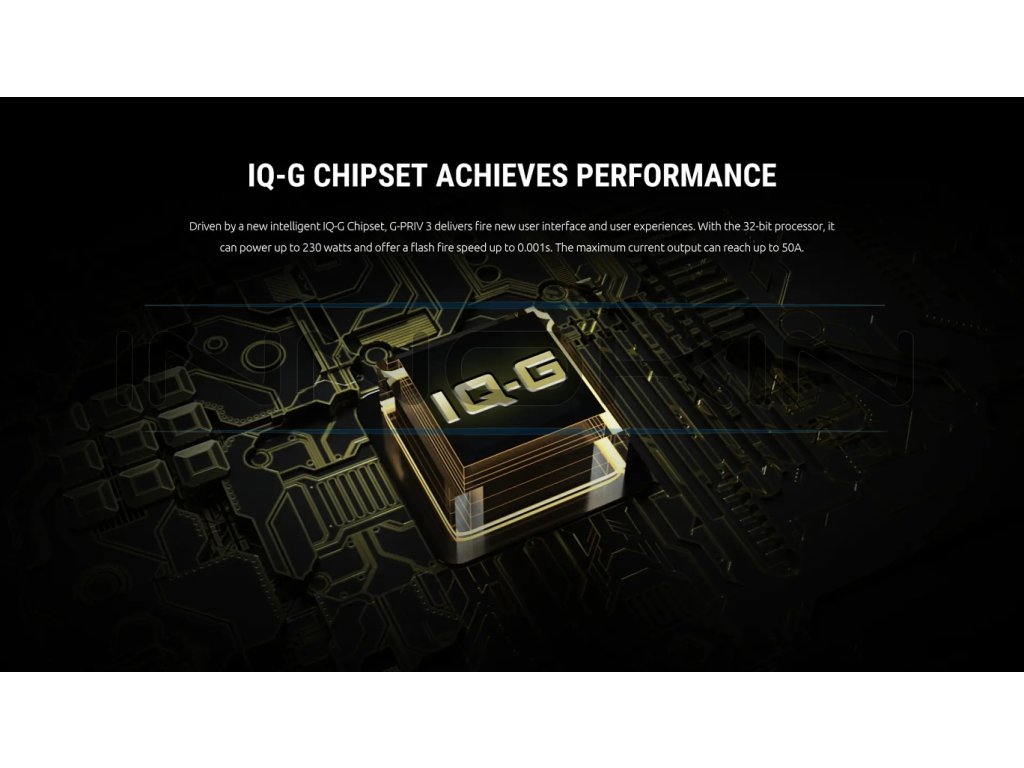 Propracovaný Chipset IQ-G Zařízení si můžete také zabezpečit pomocí hesla, například proti nechtěnému použití dětmi, či jinou osobou. Veškerá tato nastavení i samotný výkon řídí moderní IQ-G chipset, který zároveň nabízí celou řadu ochranných mechanismů, jakými jsou například ochrana proti zkratu, automatická deaktivace žhavení při nechtěném dlouhém stisku 10 sec., inteligentní rozpoznání použitého odporu atomizéru, ochranu proti přehřátí aj.