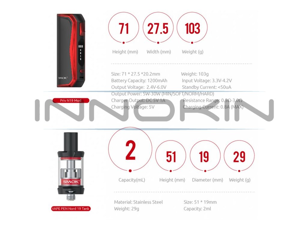 Priv N19 je nejnovějším a nejpropracovanějším přírůstkem této oblíbené řady gripů od Smoktechu. Vestavěná baterie o kapacitě 1200mAh je vybavena přehledným LED indikátorem stavu nabití. Grip nabízí čtyři možnosti nastavění výkonu až do 30W, a to MIN/SOFT/NORM a HARD. Mezi jeho další přednosti patří ochrana proti zkratu a přehřátí nebo osmi vteřinová ochrana žhavení. Clearomizer Nord 19 je osazen žhavicími hlavami Nord, které se osvědčili ve stejnojmenné e-cigaretě. Odpor 1,4ohm je pak ideální kompromis k produkci páry a skvělému podání chuti. Náustek je pevnou součástí vrchní krytky clearomizeru, po jehož odšroubování lze jednoduše doplnit až 2ml liquidu. Tank lze pak regulovat spodním přívodem vzduchu.