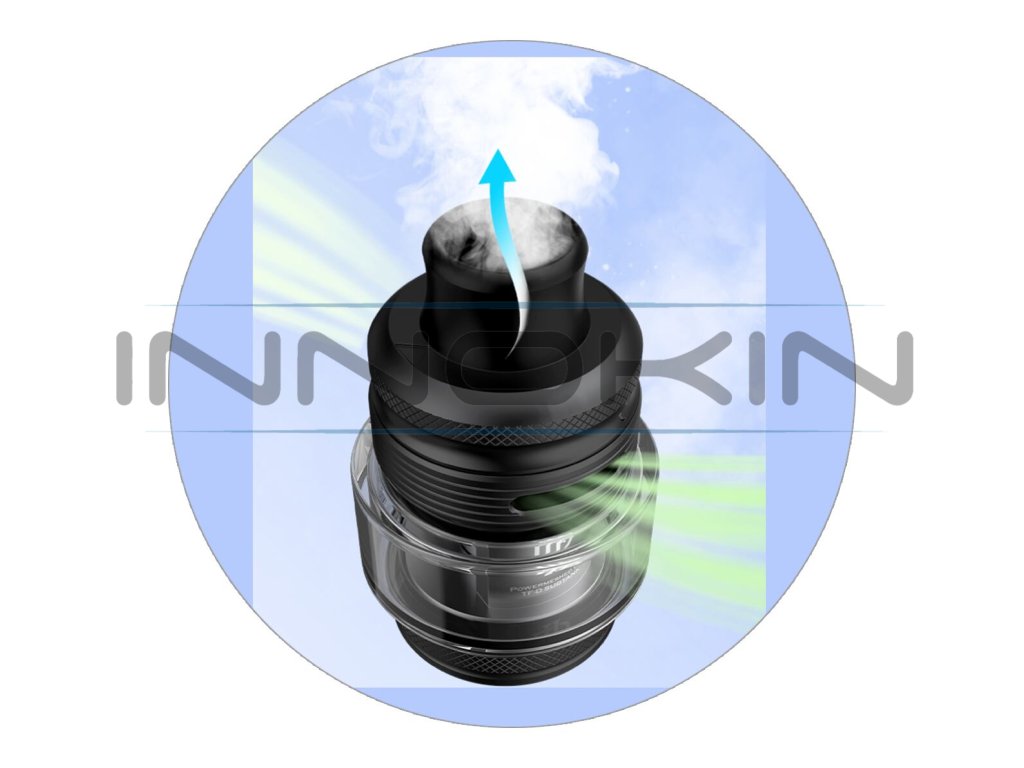 U atomizéru nesmí chybět také přepracovaný systém regulace airflow. Ten se nachází v horní části atomizéru, eliminuje tak problémy s možným vytečením e-liquidu spodním vzduchovým otvorem a zároveň přináší lepší cirkulaci vzduchu v atomizéru a s tím spojené výraznější podání chuti. Systém je plně regulovatelný a umožní vám snadnou volbu mezi volnější nebo utaženější formou DL potahu.